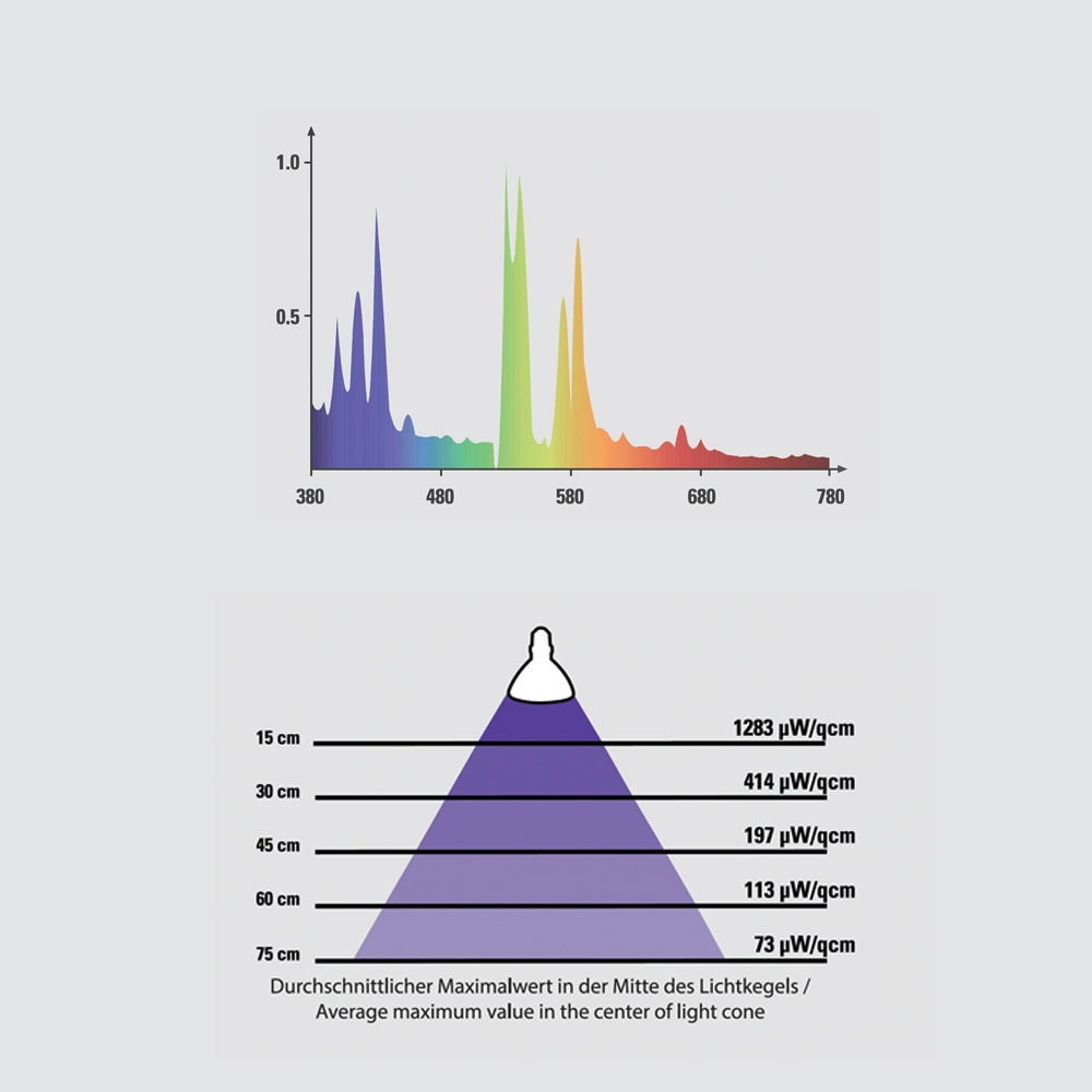 Линейный спектр до 5000 К и коэффициент отражения цветового отражения (CRI) выше 86 вносят настоящий солнечный свет на террариум, а лампа HID обеспечивает почти естественные условия освещения, которые идеально поддерживают восприятие цветов и обеспечивают оптимальное излучение UV-A и UV-B. Метаалогенная лампа способствует синтезу витамина D3, который является основным состоянием для правильного развития структуры кости и террариумовой раковины животных. Естественное восприятие, а также аппетит и готовность к деторождению значительно увеличиваются благодаря соответствующему УФ.