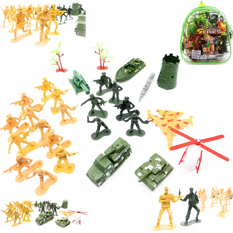 В набор входят игрушечные солдатики, военная машина, танк, самолет, вертолет, катер, катер, башня и деревья. Фигурки выполнены из пластика, в разных позах и в 2-х разных цветах: зеленом и коричневом. Солдаты оснащены оружием. Все элементы выполнены в реалистичных военных цветах.