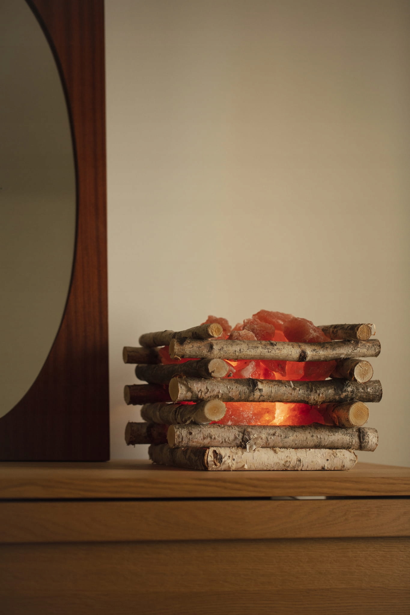 Соляная лампа для костра изготовлена из маленьких кристаллов натуральной оранжевой соли, расположенных в структуре из необработанных березовых веток в форме костра.