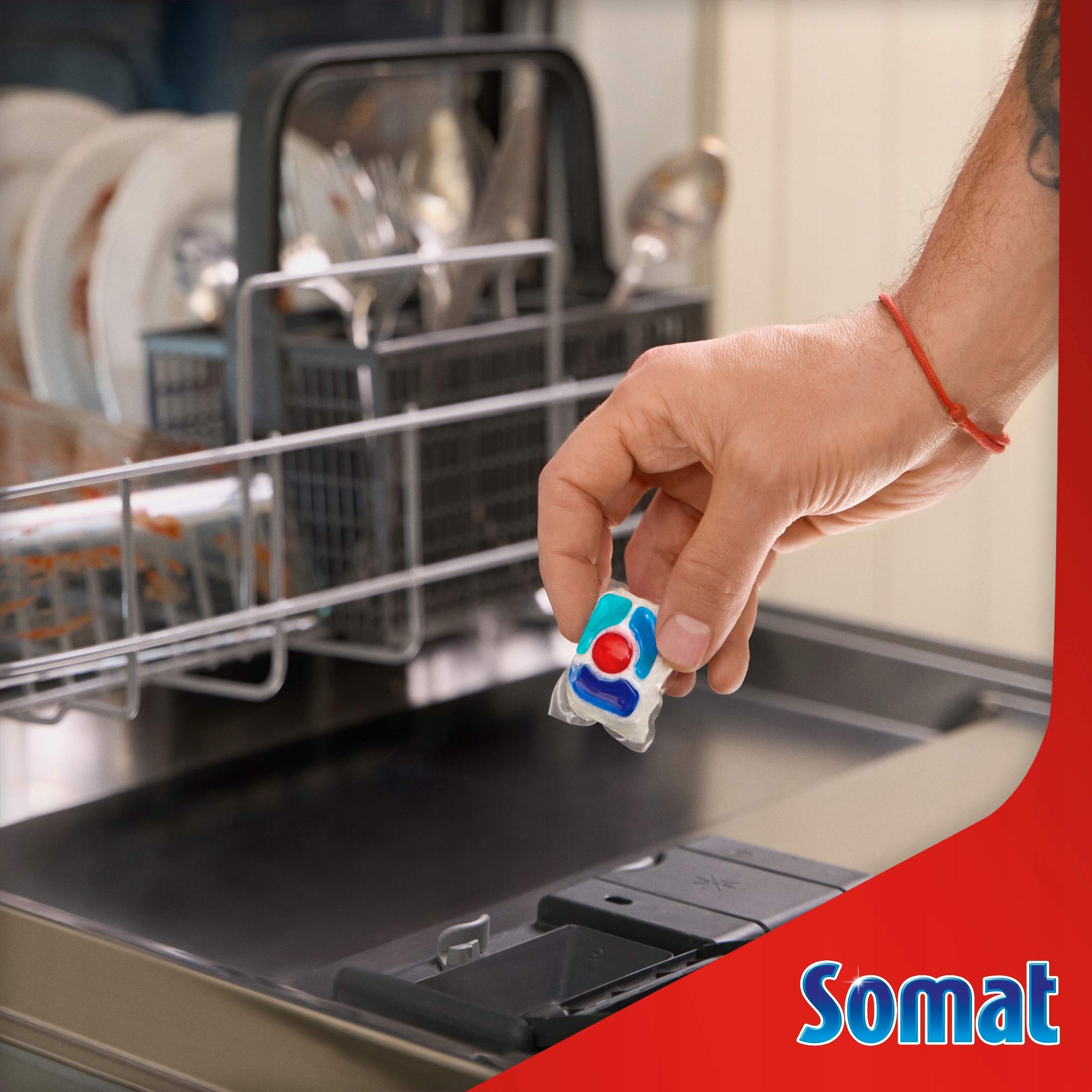 Уничтожьте жир: Капсулы для мытья посуды Somat 5-в-1 содержат активную ферментную формулу, которая растворяет стойкие пригоревшие остатки пищи и жир даже при низкотемпературных циклах.