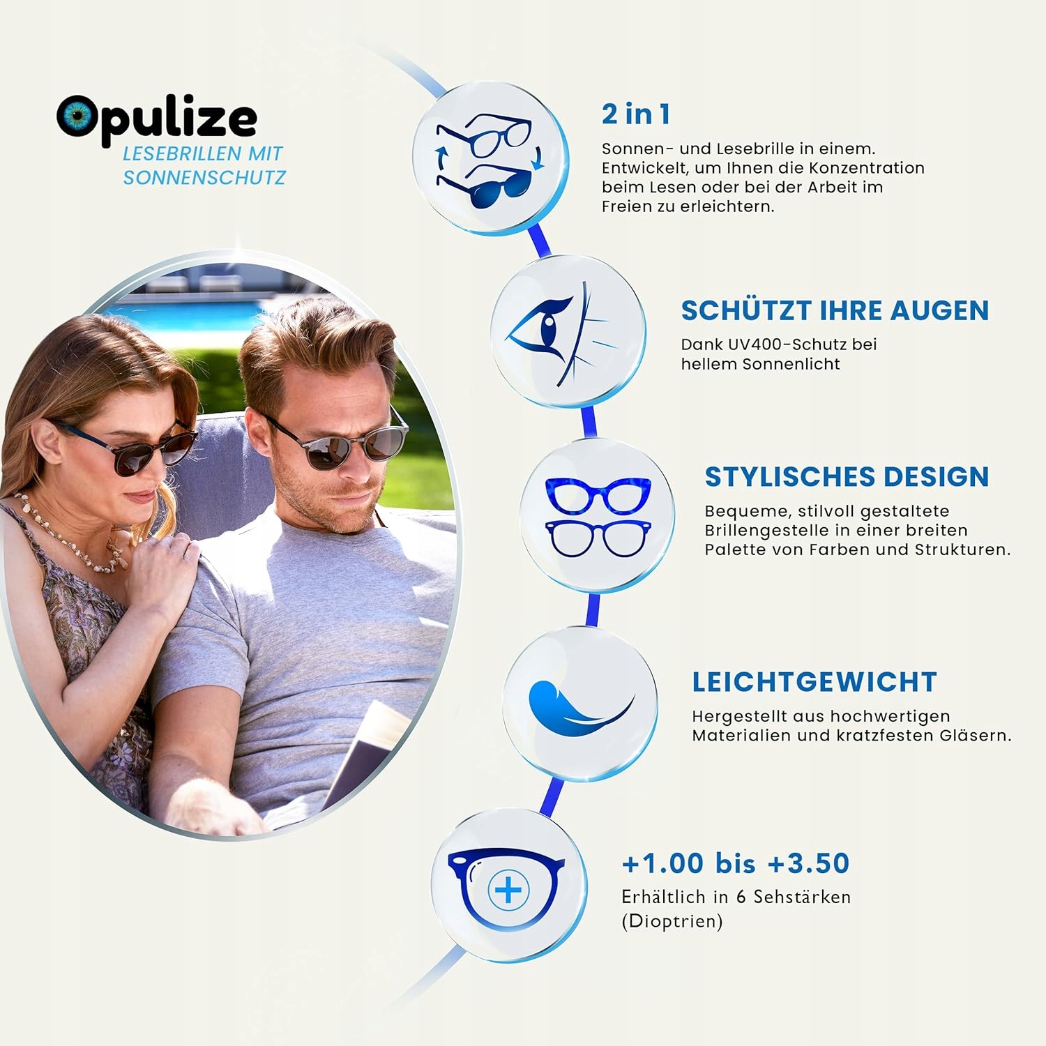 Описание продукта КАЧЕСТВО И СТИЛЬ. Солнцезащитные очки для чтения ZEN предлагают невероятное соотношение цены и качества, уделяя при этом особое внимание качеству. Эти модные, легкие очки идеально подходят для слегка узких лиц и созданы с учетом комфорта. ЛЕТНЕЕ СОЛНЦЕ. Вам трудно читать на солнце? С этими чрезвычайно доступными солнцезащитными очками для мужчин и женщин вы сможете защитить свои глаза и при этом ясно видеть. Линзы UV400. Они блокируют лучи UVA и UVB. УДОБНАЯ ПОСАДКА: наши стильные солнцезащитные очки Opulize ZEN с устойчивыми к царапинам линзами хорошо смотрятся даже на лицах немного меньшего размера. Эта легкая рама обеспечивает удобную посадку для повседневного использования. Адрес производителя/импортера Электронная почта: info@opulize.co.uk | Телефон: +442089531102
