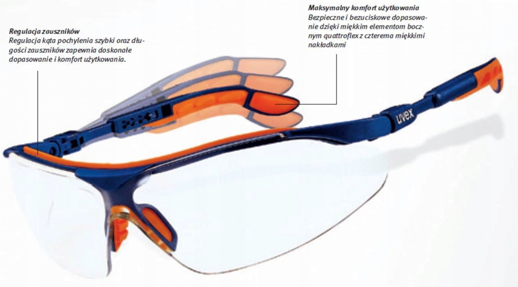 Uvex i-vo – это бескомпромиссный комфорт и внешний вид: никаких компромиссов в безопасности, комфорте и дизайне. Это гарантирует наша двухкомпонентная технология: двухкомпонентная конструкция делает очки жесткими и устойчивыми в тех местах, где это необходимо, и мягкими в чувствительных областях носа, лба и ушей. Причем длина и наклон заушников регулируются многоступенчато. Это гарантирует оптимальный и длительный комфорт использования.