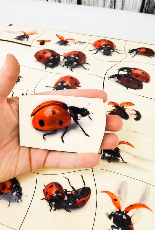 Большая головоломка займет ребенка дольше, потому что уложить его не так просто. Большая база обеспечивает прозрачность изложенных элементов, а большие размеры божьих коровки также подходят для небольших рук.