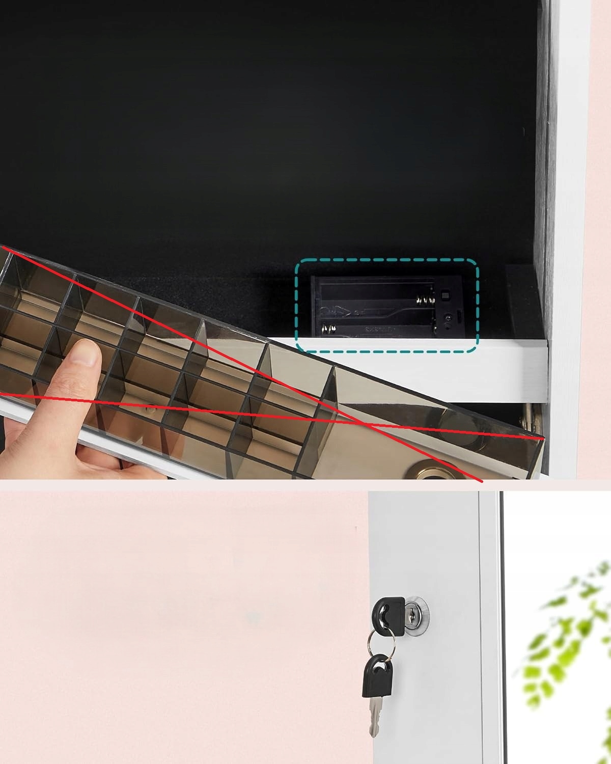 Для всех любителей ювелирных изделий и модных аксессуаров шкаф с зеркалом для ювелирных изделий предлагает возможность элегантного и прозрачного хранения. Благодаря лакированному из бело -покрытого дерева и большим зеркальным дверям, декоративное зеркало станет украшением любой спальни, гардероба или молодежной комнаты. Организован и легко доступен. (Не включен)