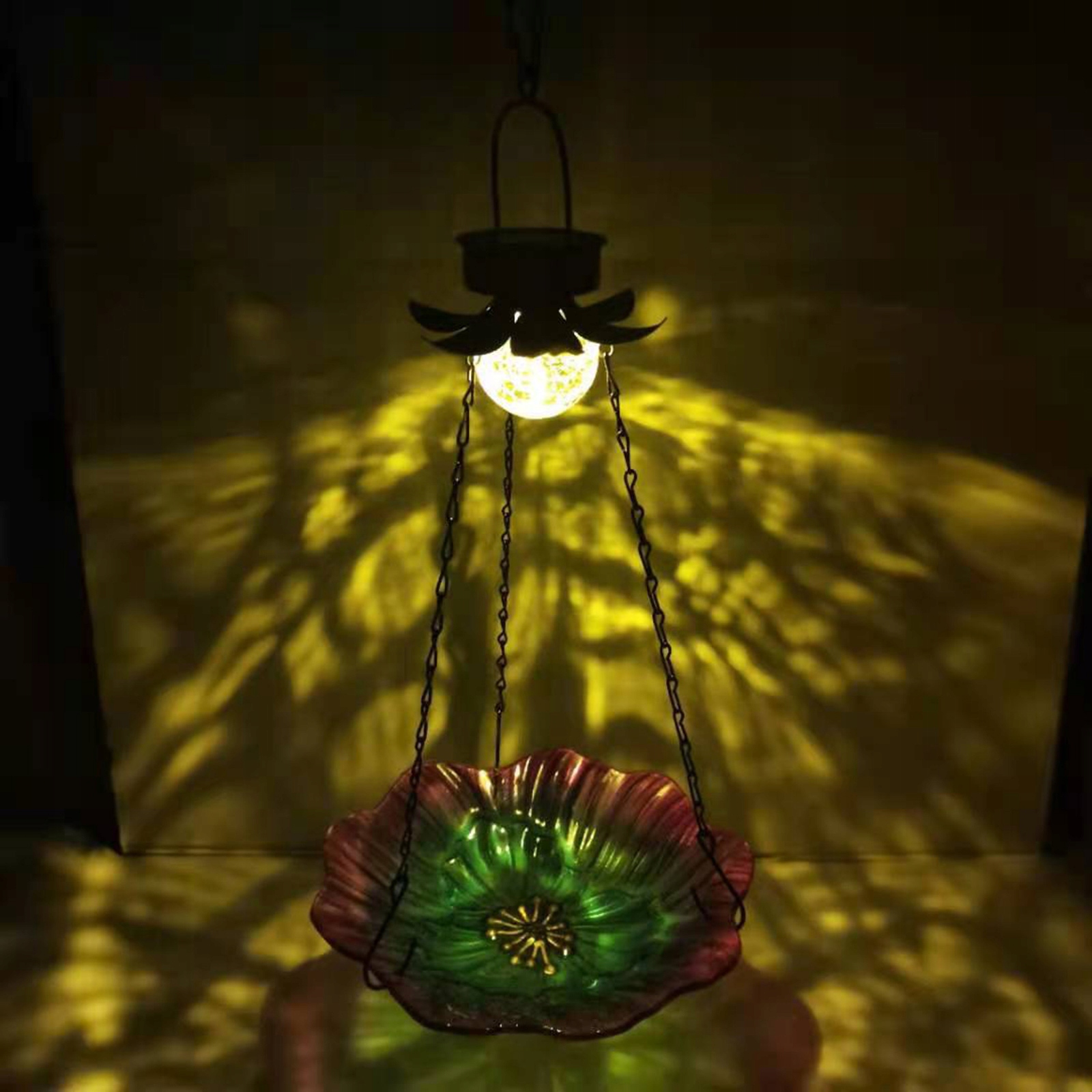 Фантастический садовый декор: поднос имеет форму синего цветка, а желтый свет был разработан из потрескавшегося стекла, как красивый хрустальный шарик, обеспечивая теплый свет и романтическую атмосферу для вашего двора. Требованный стеклянный дизайн с теплым желтым огнем, обеспечивающий романтический свет, атмосферу для вашего двора. Не только подвесная кормушка для птиц или ванна для птиц снаружи, но и солнечное освещение сада.