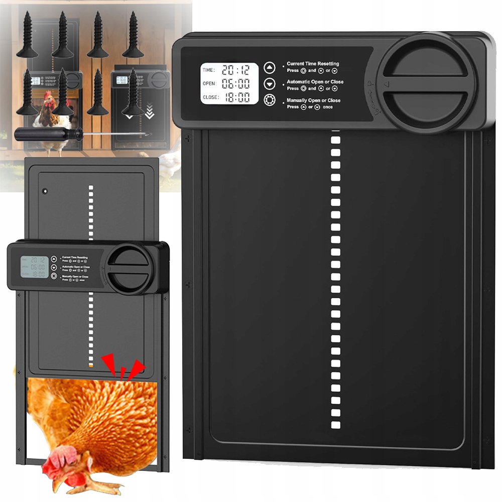 Автоматические двери куриного куча оснащены интегрированным ЖК -экраном, который обеспечивает простое и точное регулирование времени открытия и закрытия. Установка проста и может быть сделана без сложной электрической установки.