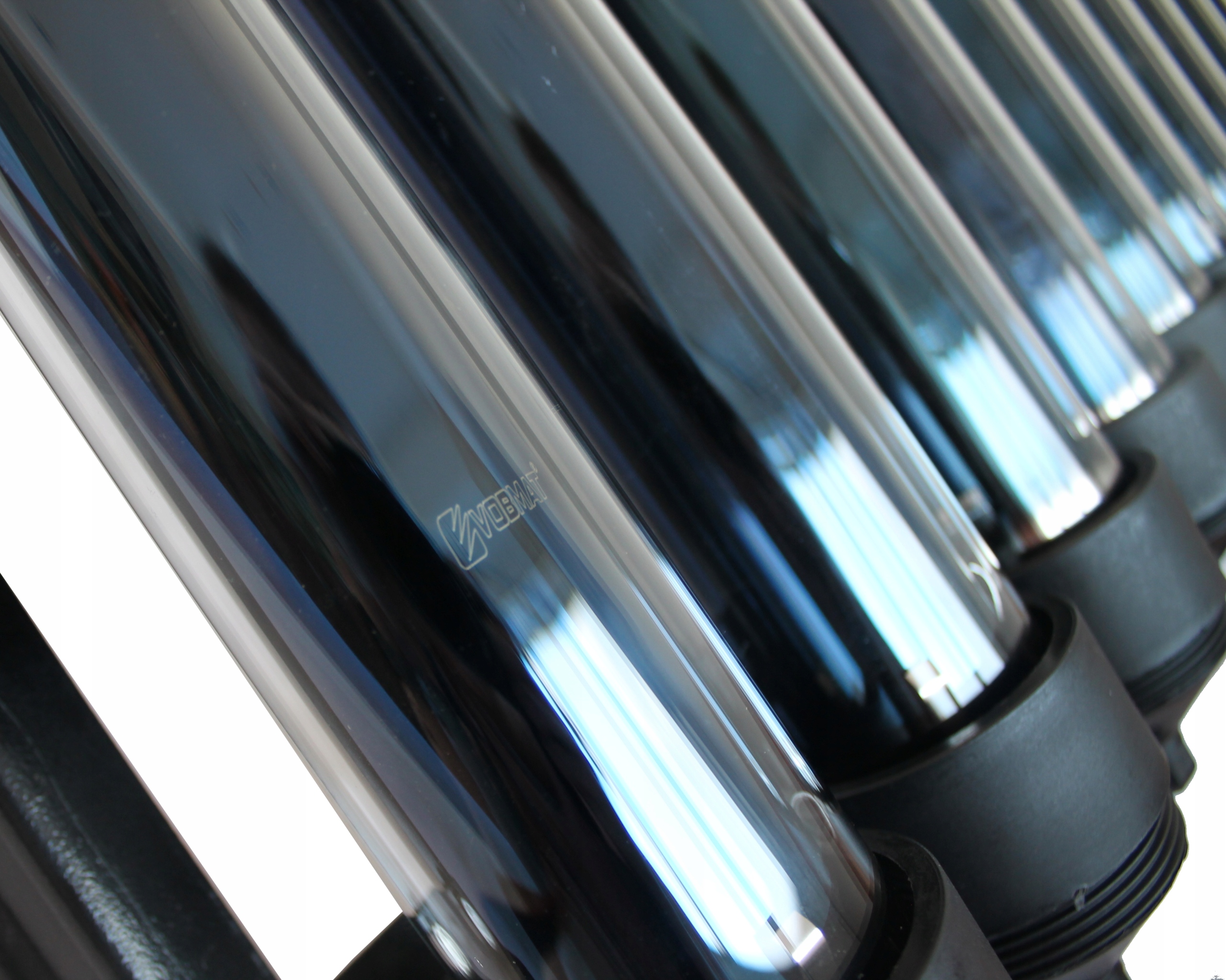 - Вакуумные трубки изготовлены из высококачественного боросиликатного стекла. Между двумя слоями стекла существует вакуум, который является отличным изолятором, предотвращающим потери тепла. На стекло нанесен тройной поглотитель последнего поколения ALN/AIN-SS/CU, который используется для концентрирования прямого или рассеяния солнечного излучения. Отдельные слои нанесенного поглотителя используются для поглощения солнечной радиации и преобразования ее в тепловую энергию. Задача последующих слоев поглотителя — сохранить как можно больше энергии внутри электронных ламп, не допуская ее потери за счет инфракрасного излучения. Температура внутри труб может достигать почти 300 0С. Внутри каждой вакуумной трубки находится алюминиевый радиатор, в центральной части которого находится медная трубка (тепловая трубка). Медь, из которой изготовлена тепловая трубка, бескислородная, что обеспечивает длительную и надежную работу трубы. Вещество заключено внутри тепловой трубки и начинает кипеть при температуре 25С.