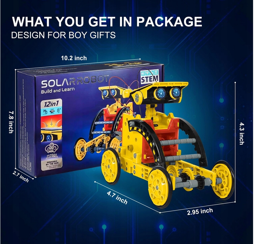 - Солнечный робот 12 в 1. Этот строительный робот имеет 12 различных моделей, предназначенных для перемещения. на земле и воде. Дети в возрасте от 8 до 14 лет могут изучать сборку роботов и различные основные понятия физики, весело проводя время, развивая свои практические навыки и воображение.