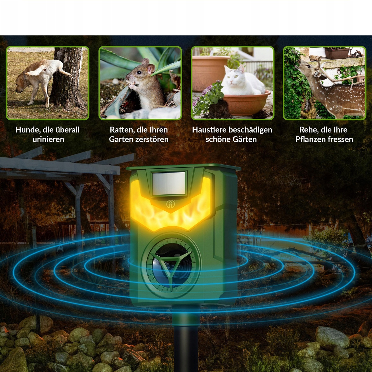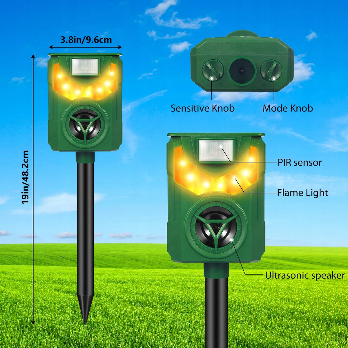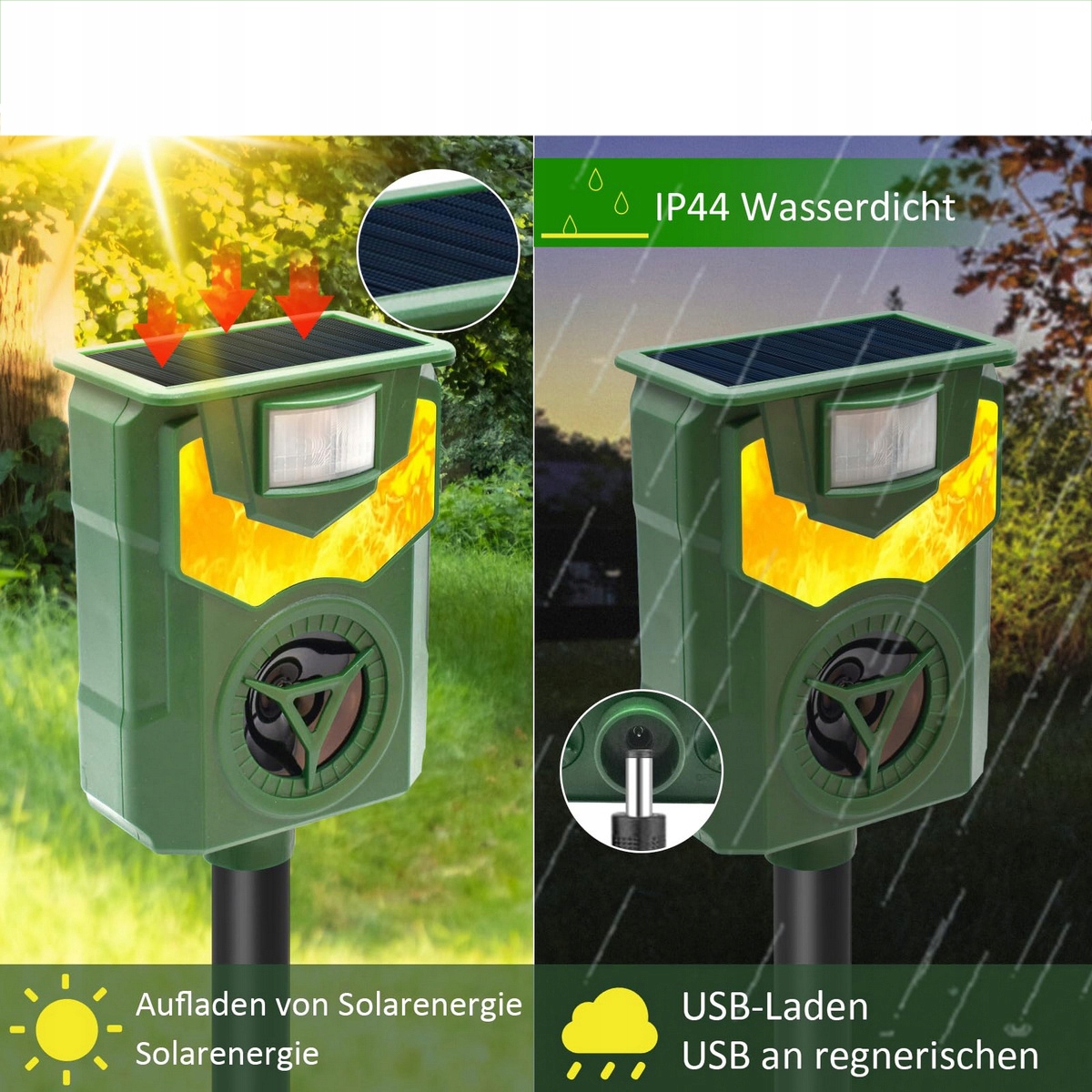 Ультразвуковой отпугиватель животных. Наш солнечный отпугиватель животных имеет встроенную высокочувствительную систему обнаружения движения. При обнаружении проникновения диких животных репеллент излучает сильную ультразвуковую модель, а также пламя, чтобы отпугнуть животных. Это гуманный способ. Ультразвук отпугнет диких животных, но не причинит им вреда. Примечание. Для некоторых животных видимый эффект может проявиться через 1–4 недели!