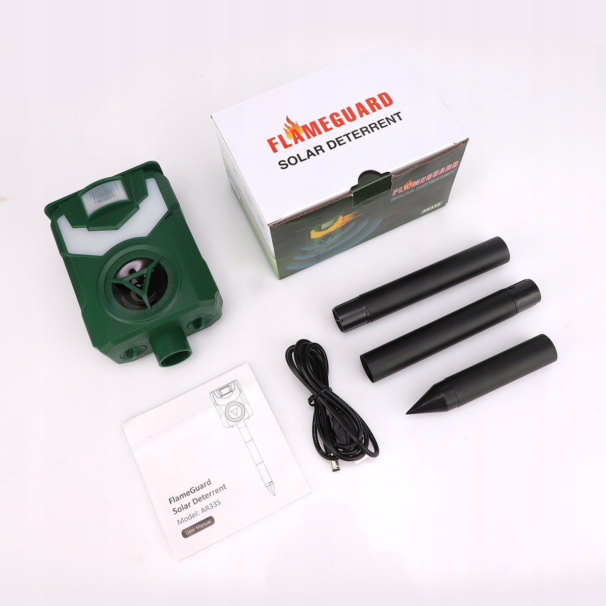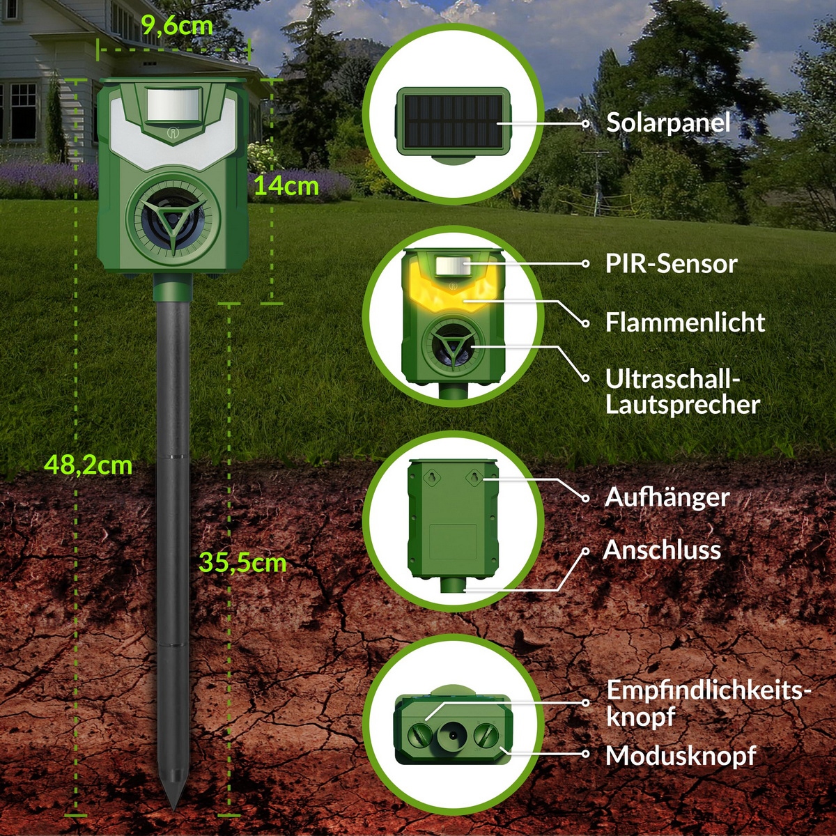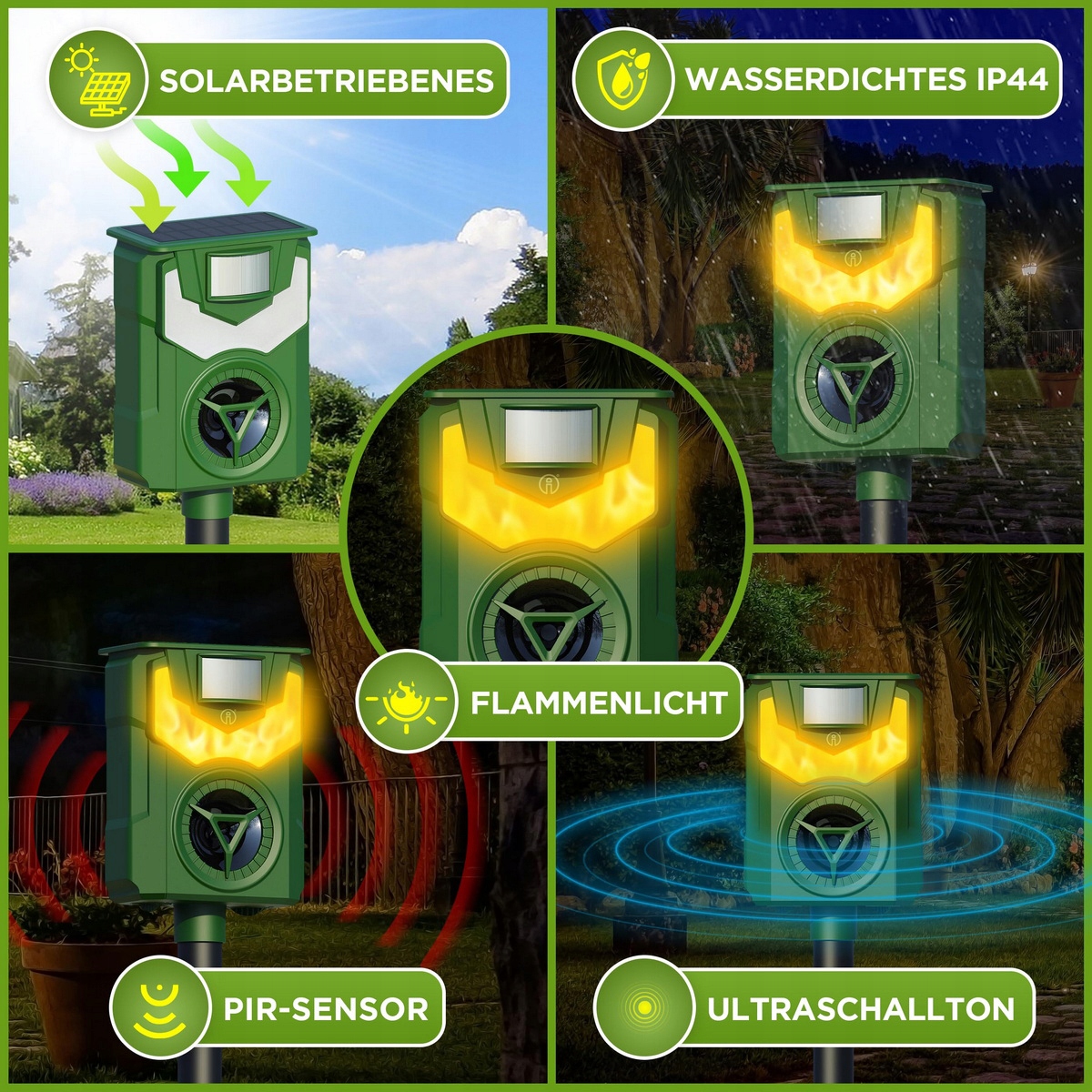 Ультразвуковой отпугиватель животных. Наш солнечный отпугиватель животных имеет встроенную высокочувствительную систему обнаружения движения. При обнаружении проникновения диких животных репеллент излучает сильную ультразвуковую модель, а также пламя, чтобы отпугнуть животных. Это гуманный способ. Ультразвук отпугнет диких животных, но не причинит им вреда. Примечание. Для некоторых животных видимый эффект может проявиться через 1–4 недели!