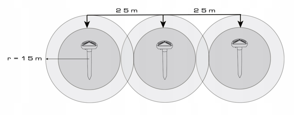 Однако сфера действия отпугивателя зависит от типа почвы. Сухой песчаный субстрат хуже проводит звуковые волны, и защитная площадь может уменьшиться до половины (в этом случае следует рассмотреть возможность использования двух репеллентов). Наилучший эффект будет достигнут при влажной или глинистой почве. Эффект виден через мин. 5-7 дней. Однако рекомендуется использовать отпугиватель более длительное время, чтобы избежать возвращения вредителей.