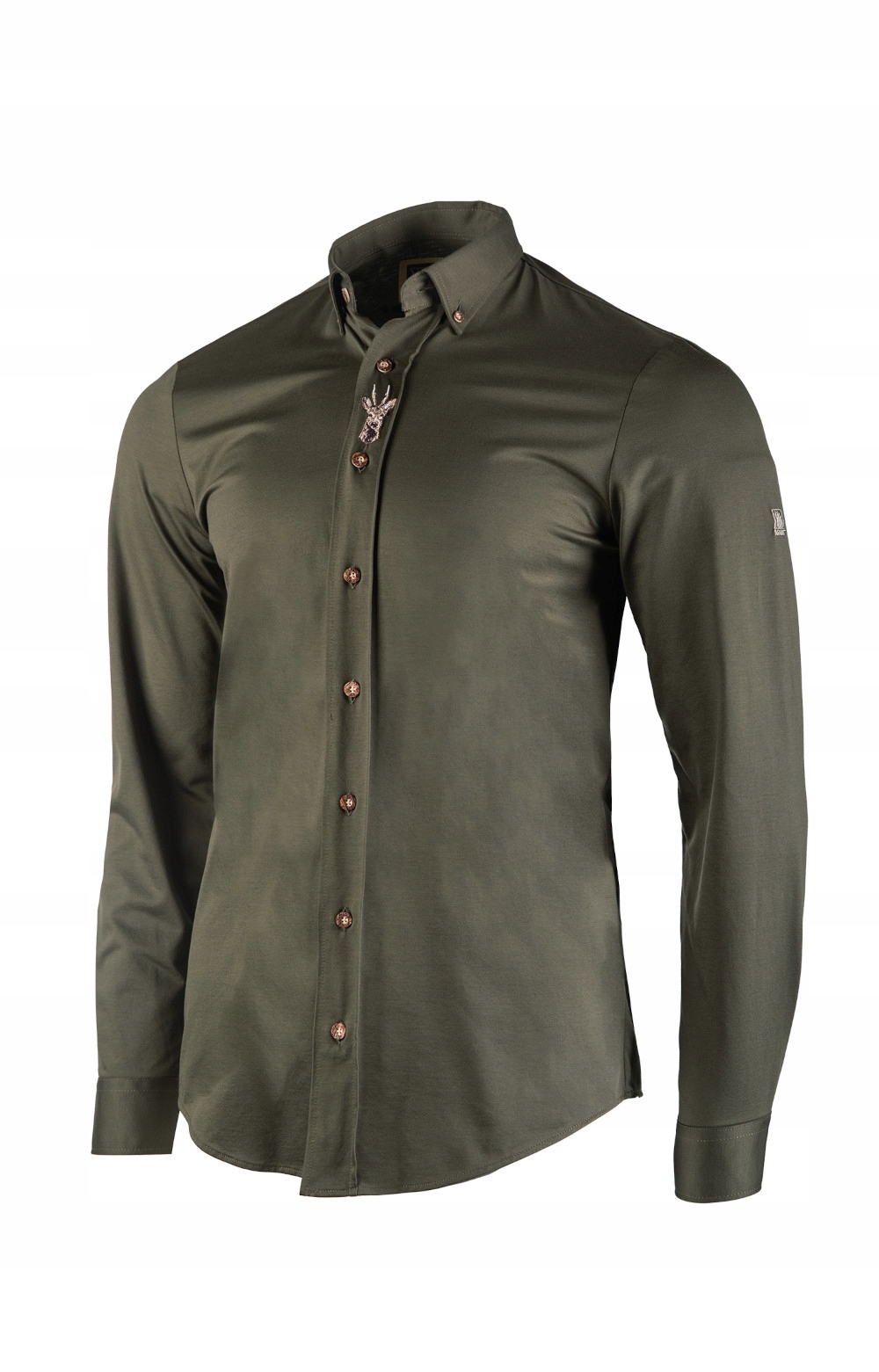 Элегантная и эксклюзивная мужская рубашка зеленого цвета, изготовленная из 100% хлопка. На рубашке вышита голова рогоносца, а пуговицы - благодаря < имитации рогов сделайте эту рубашку уникальной и в то же время придайте ей охотничий характер. Рубашка идеальна для встреч с друзьями и коллегами-охотниками.