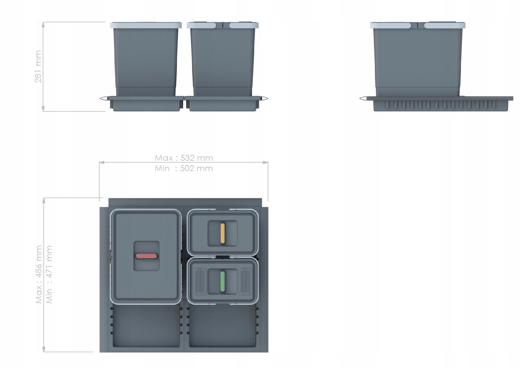 В комплект входят три мусорных бака, три крышки, в том числе одна с фильтром, две модульные накладки, два отделения и три гибкие планки, крепящиеся по краям селектора.