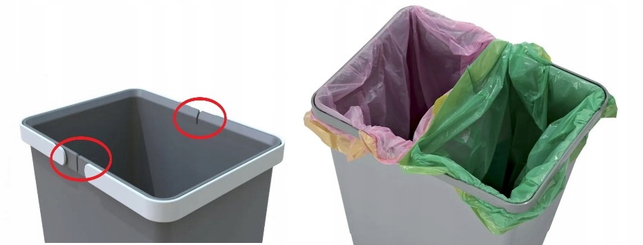 ✔️ вырезы на поверхности корзин, позволяющие разместить в каждой из них по два мешка для мусора