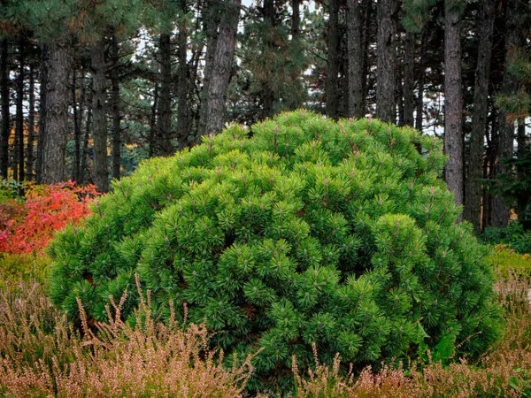 Хвоя плотная двойная, 2-4 см длиной, темно-зеленая, расположена на веточках радиально. Сорт полностью морозостоек, светолюбив – требует солнечного положения, не требователен к почве.
