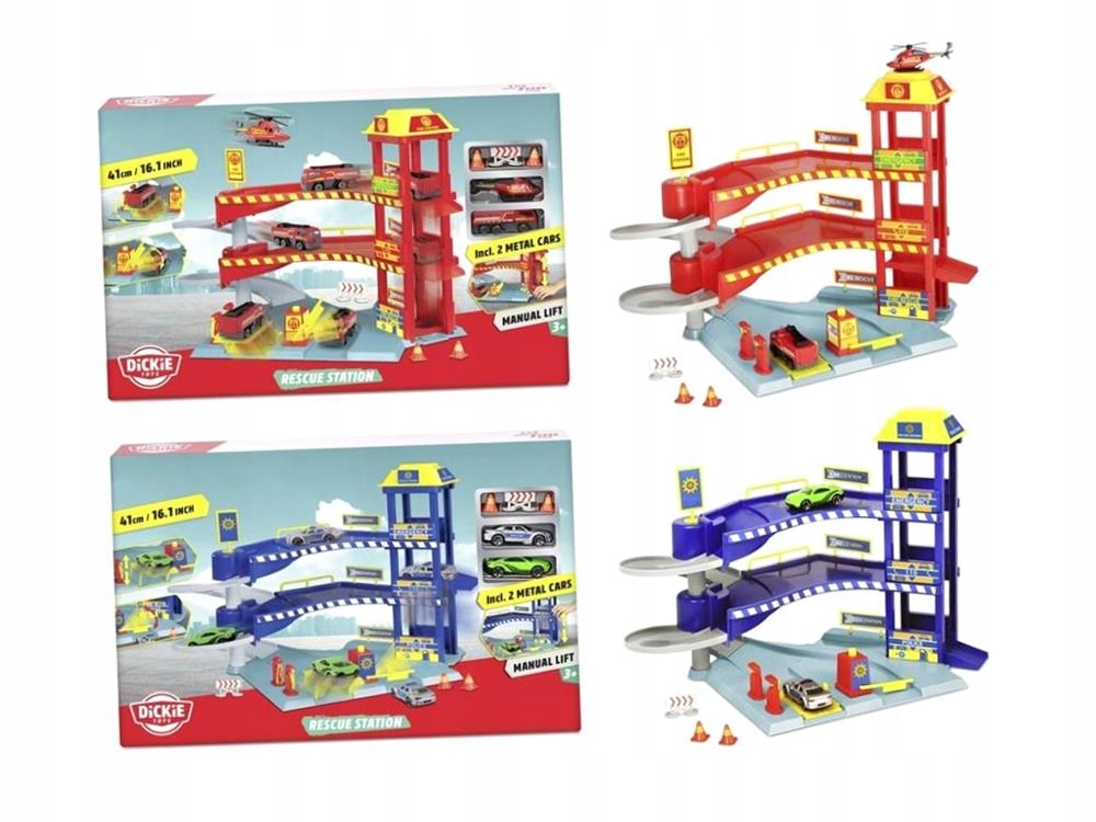 Вы можете выбрать из двух спасательных станций в виде 3 двухсторонных гаражей с посадкой. У них есть барьер на входе, топливная станция, набор транспортных кругов и автомобильный лифт, контролируемый ручным. Набор включает в себя два транспортных средства. Гражданские автомобильные и радио -офицеры прикреплены к полицейскому участку, а пожарная машина и спасательный вертолет. Высота: 41 см, 3L+