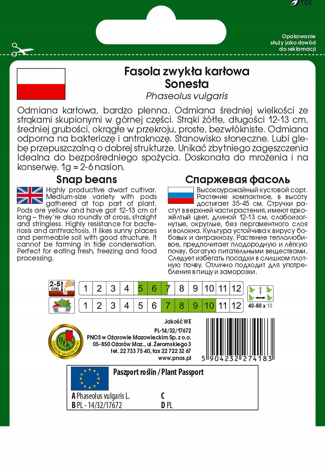 Sonesta - это сорт карлика, средний, очень плодородный. Растение характеризуется построенной привычкой, с сильной ветвью. Он достигает довольно маленького размера. Стручки прямые, мясистые, с длиной 12-13 см достигают диаметра выше 1 см.