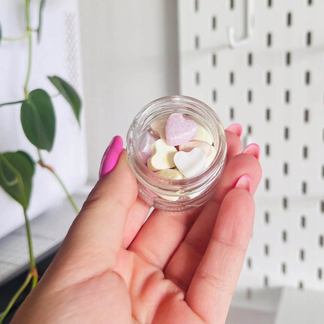 В мини-баночке находятся измельченные конфеты разных цветов и в форме сердечек, которые растворяются во рту.