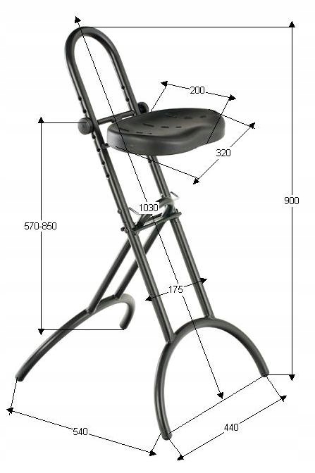 Противоскользящее сиденье черного (RAL 9005). Регулировка высоты сиденья с помощью ступенек в раме табурета. Каркас металлический, табуретка складная. Основание состоит из двух ножек с мягкими нескользящими ножками.