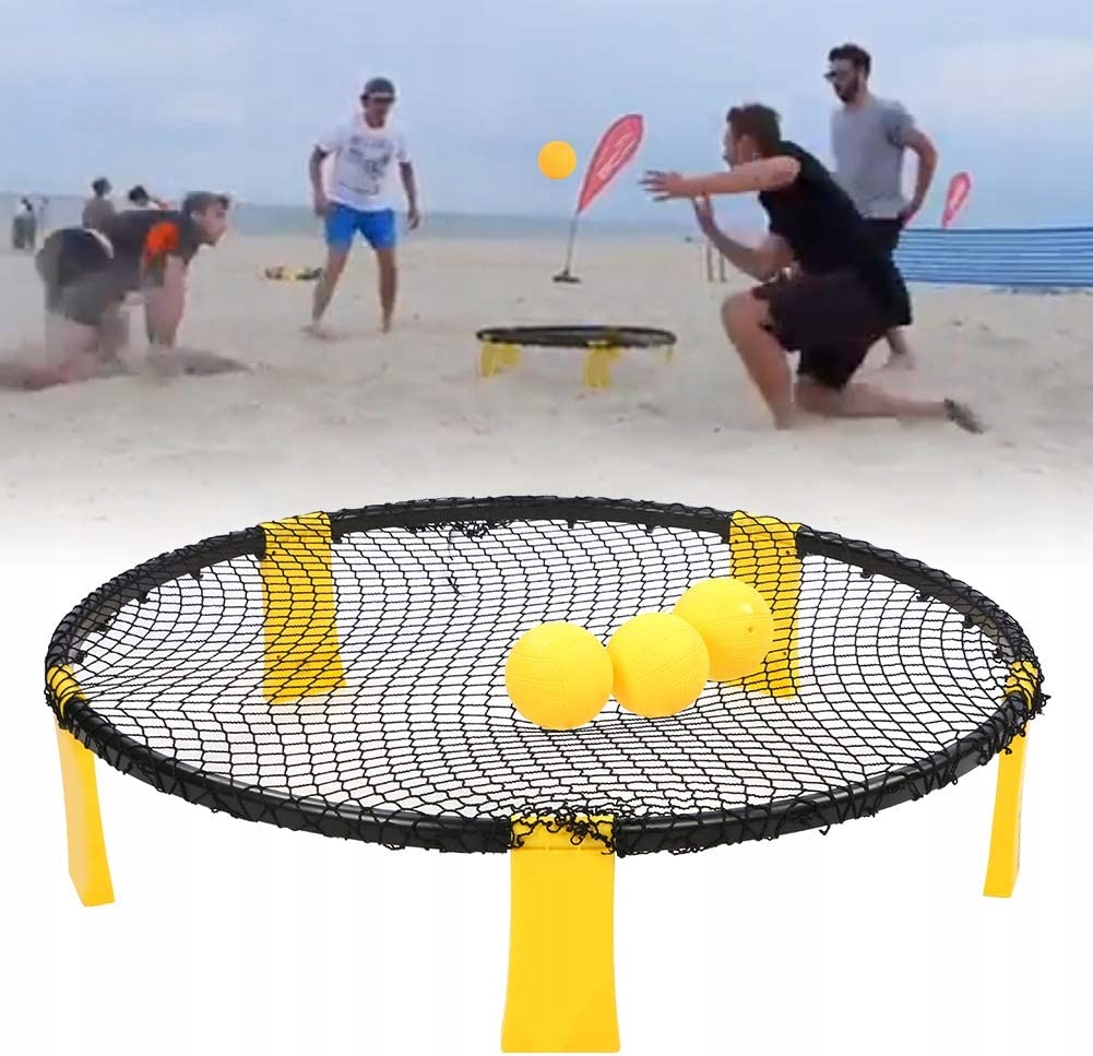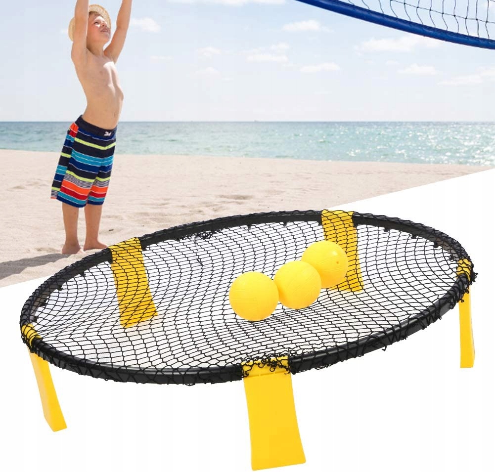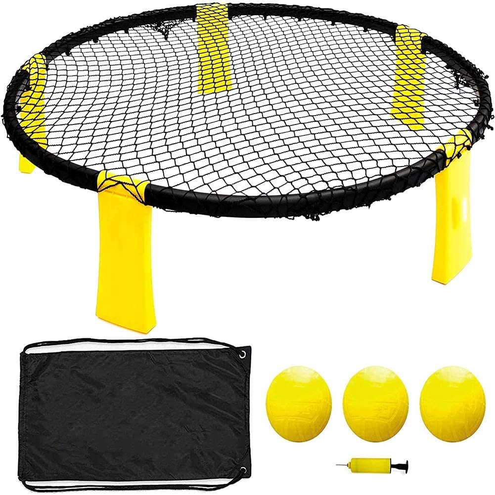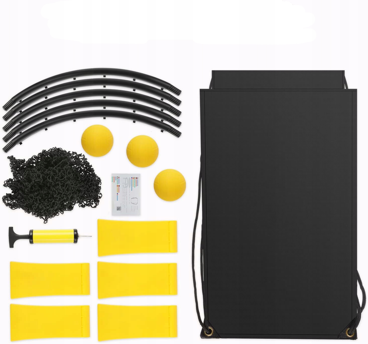 В комплект входят: 3 мяча с шипами, сумка на шнурке для хранения и книги с правилами. Гибкая нейлоновая сетка регулируется и позволяет регулировать натяжение сетки по вашему желанию. В игру можно играть где угодно: на траве, песке или в помещении.