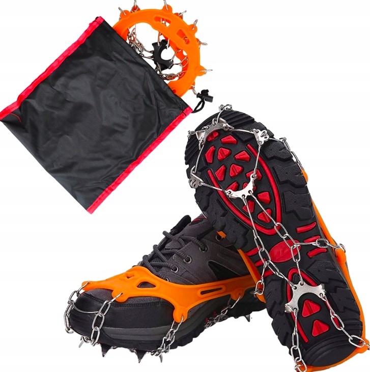 Гибкие резиновые шкуры с не -скользящими шипами. Каждое наложение содержит 8 зубов из закаленной стали и цепи, которые обеспечивают очень хорошую адгезию на землю. воротник и растягиваться на подошве обуви)