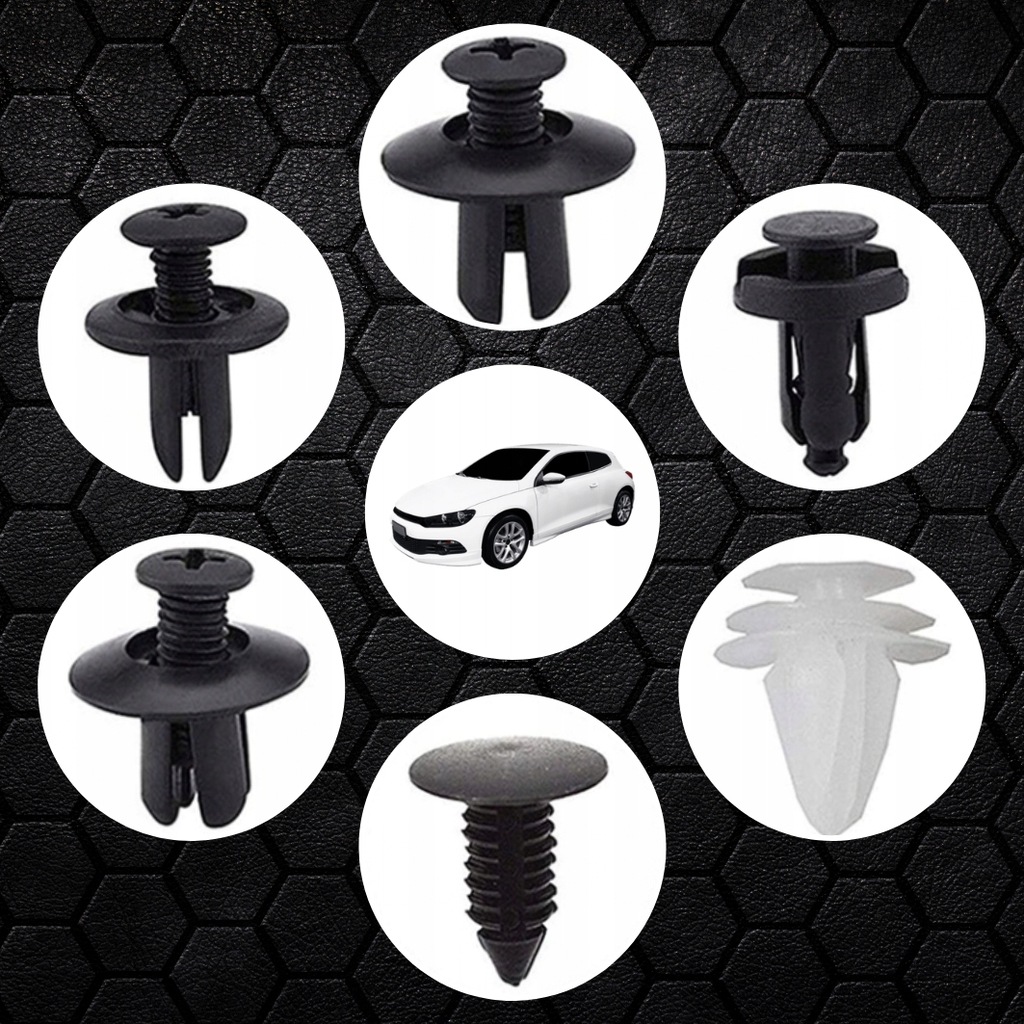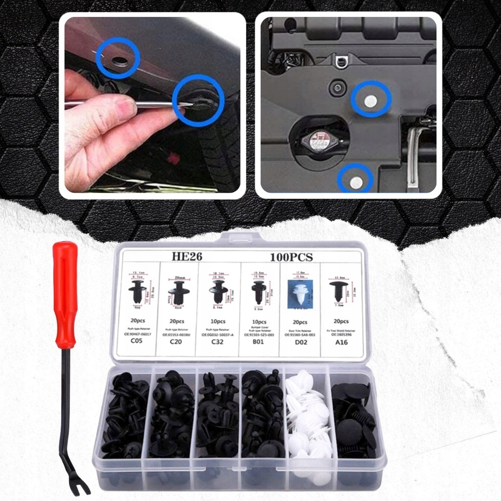 Набор, состоящий из различных типов элементов, таких как штыри, штыри, зажимы и защелки, предназначенных для крепления различных деталей в автомобилях, например обивки, пластиковых элементов , бамперы и уплотнители, доступны в универсальных размерах, которые обычно используются в большинстве марок автомобилей.