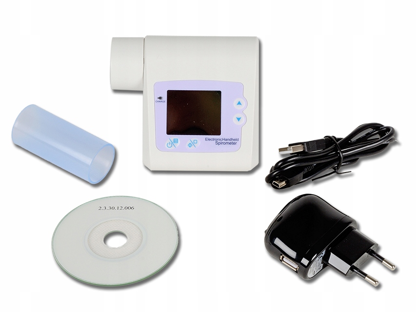 Карманный портативный спирометр с большим TFT-экраном для четкого отображения цифр и графиков потока. Синхронное измерение ФЖЕЛ, ПСВ, ОФВ1, ОФВ1%, ОФВ25, ФОВ2575, ФОВ75. Поддержка подтверждения диагноза по объему и отображение блок-схемы. Встроенные нормативные значения. Встроенная литиевая батарея и дисплей батареи. Поставляется с USB-кабелем для подключения к компьютеру, зарядным устройством и программным обеспечением для расчета данных и анализа тенденций.