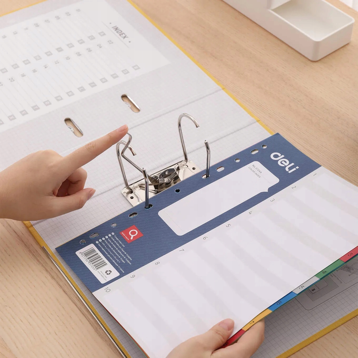 Переплет Deli, в котором хранятся документы формата А4. Папка имеет круглый вырез, поэтому ее можно легко вынуть из шкафа, а также имеет сменную этикетку, позволяющую подписать папку по вашему желанию и заменить ее содержимое, подписав ее заново. Внутри клетчатая, материал картон, поверхность покрыта полипропиленовым материалом.