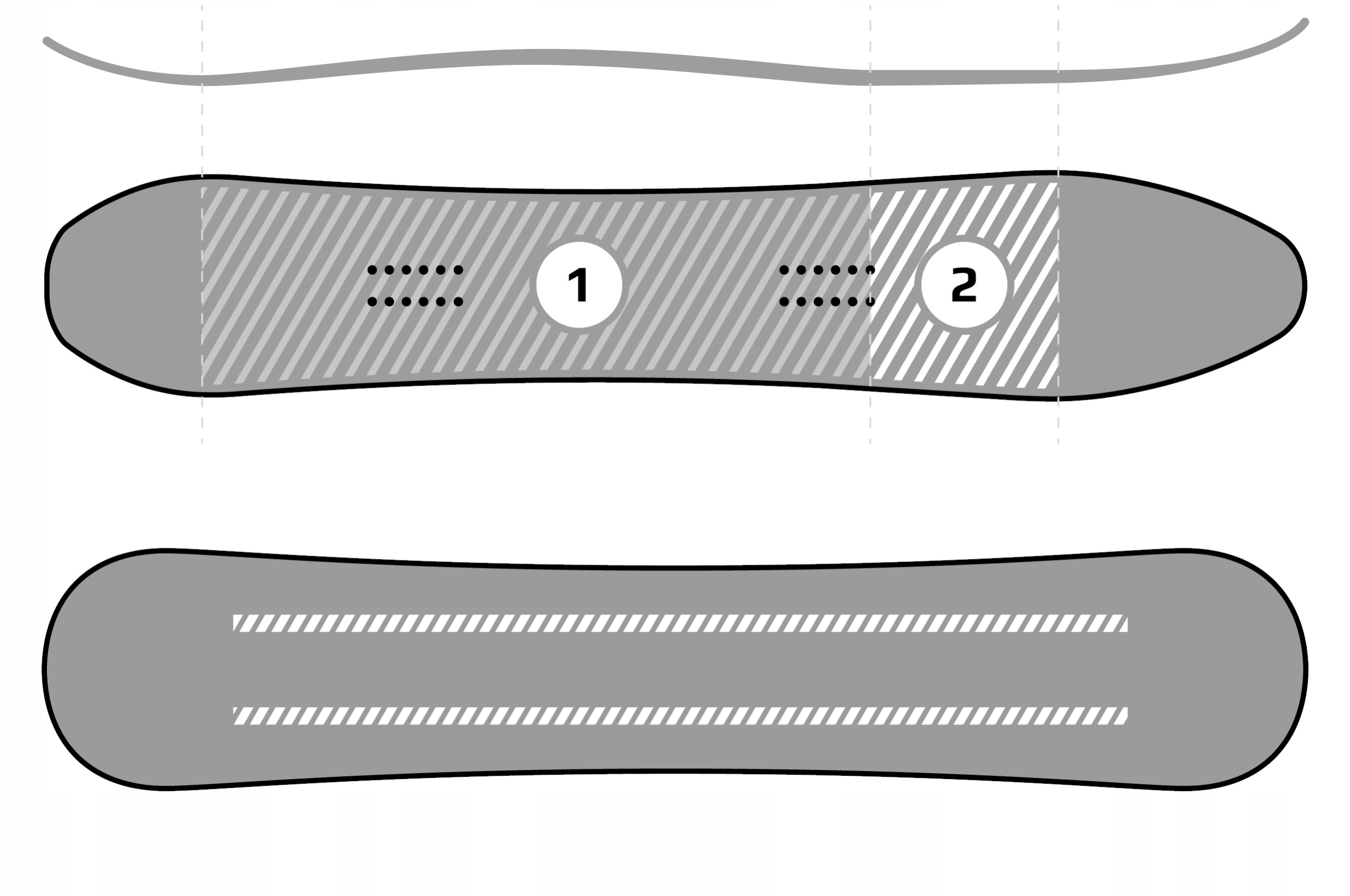 - Усиление мест крепления обвязки из стекловолокна - пластины из стекловолокна вокруг вставок, улучшающие передачу реакция сноубордиста на края доски