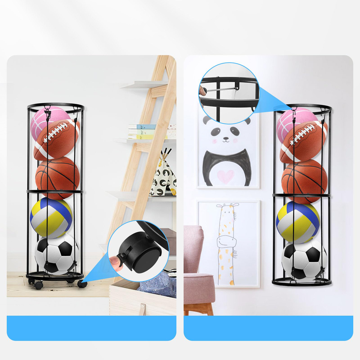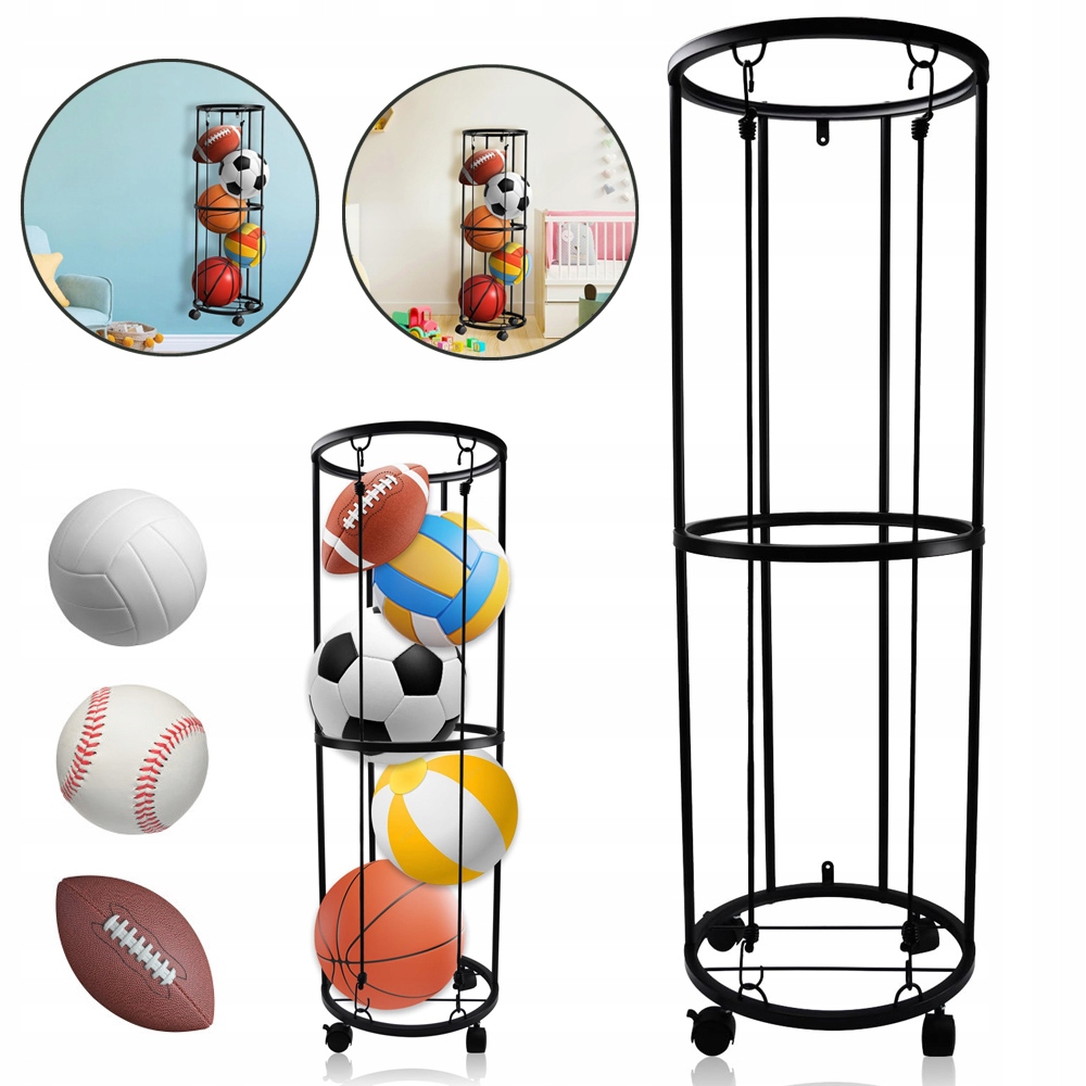 Стояк на Пилки Монтовани На ścianie Z Kółkami, Który Zaprojektowaliśmy w kształcie walca, ossczędz zwiększając przestzeń do przechowywania. Эта игровая бальная подставка практична для хранения различных спортивных мячей. В нем может разместиться пять баскетбола, футбола, волейбол и других больших шаров, но в нем также могут разместиться несколько шаров для бадминтона, тенниса и других маленьких шаров.