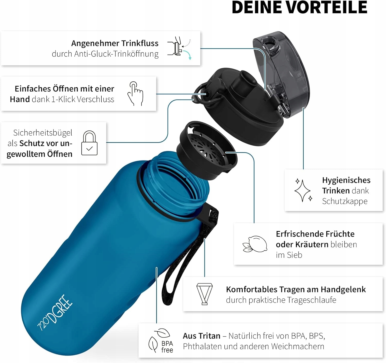 Дополнительное описание:Имеет ручку, защищающую от случайного открывания, а защитный колпачок обеспечивает гигиеничность питья. Легко открыть одной рукой благодаря защелке и удобно носить на запястье благодаря практичной петле для переноски. Он позволяет добавлять фрукты или травы, оставшиеся в ситечке, и обеспечивает приятное течение напитка благодаря отверстию, предотвращающему «бульканье». Изготовлен из тритана – естественно, не содержит BPA, BPS, фталатов и других смягчителей. Емкость 1,5л