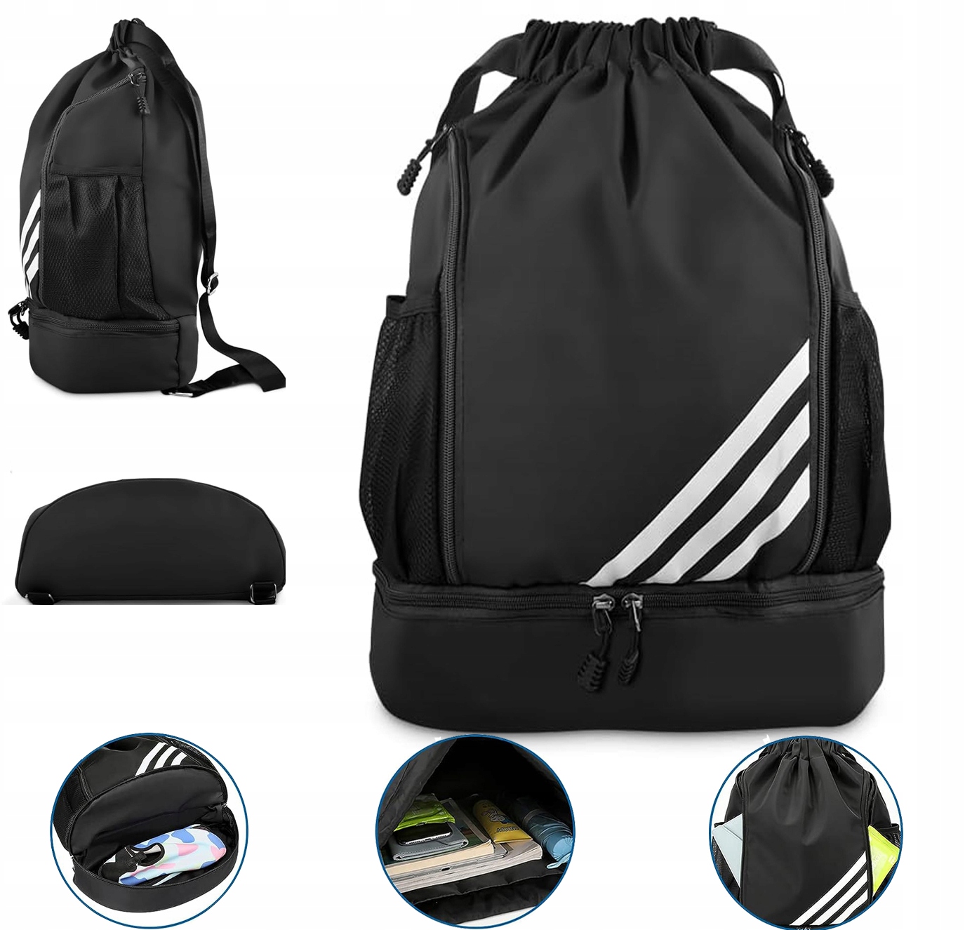 🎒 Конструкция с несколькими карманами: Сетчатые карманы с эластичными ремнями с обеих сторон спортивного рюкзака позволяют хранить бутылки с водой и зонтики. В переднем кармане можно хранить салфетки и туалетные принадлежности. Внизу имеется отдельное отделение для обуви, а внутри сумки на шнурке — дополнительный внутренний карман на молнии, достаточно большой, чтобы вместить спортивные часы, кошелек и другие мелкие ценные вещи.