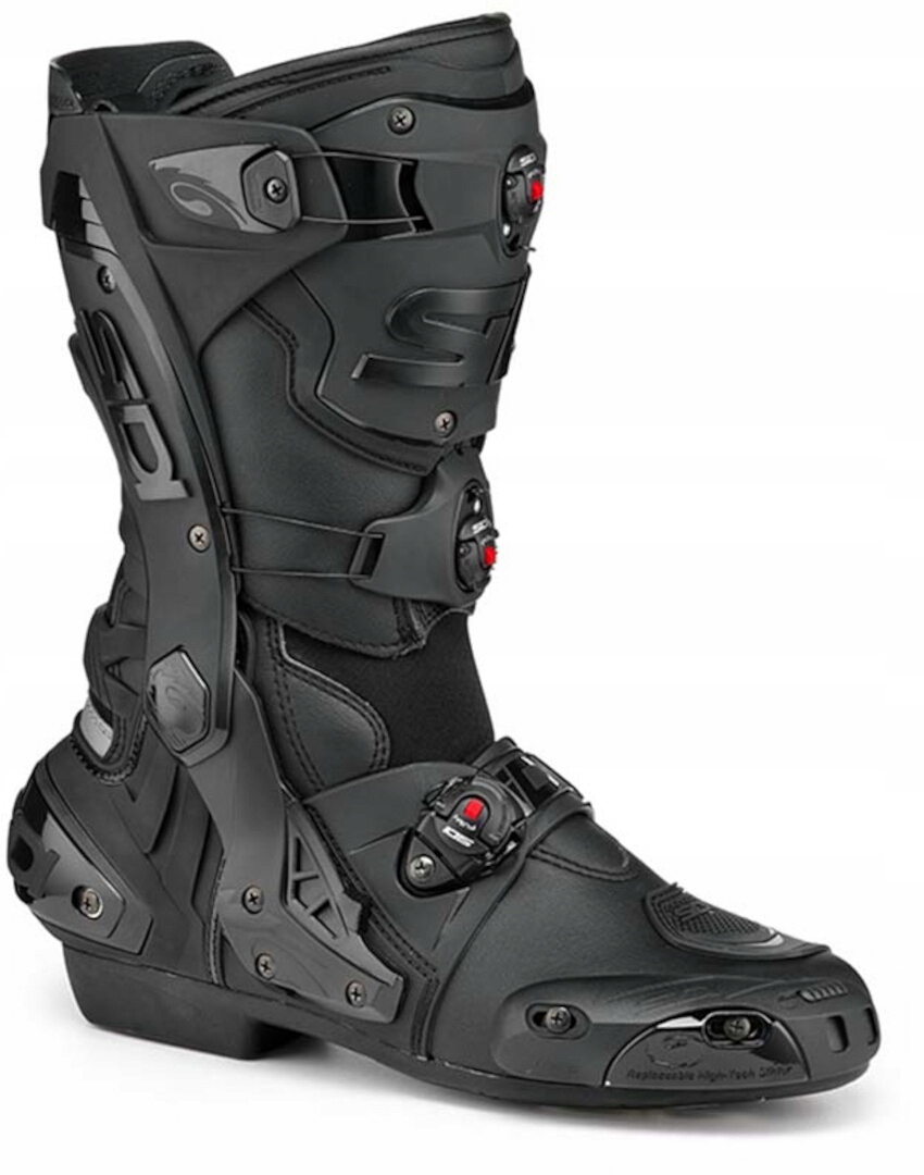 Асимметричный и анатомический крой пятки оснащен мягкой фиксированной вставкой на внутренней стороне лодыжки для лучшего сцепления и контакта с мотоциклом, системой амортизации сзади и снаружи. Корпус и система демпфирования взаимозаменяемы с помощью винта и системы блокировки.
