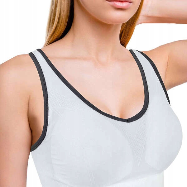Спортивный бюстгальтер белого и серого идеально подойдет женщинам, ежедневно выполняющим различные физические нагрузки. Кроме того, это идеальное решение для тех, кто ищет чрезвычайно удобный и бесшовный топ.