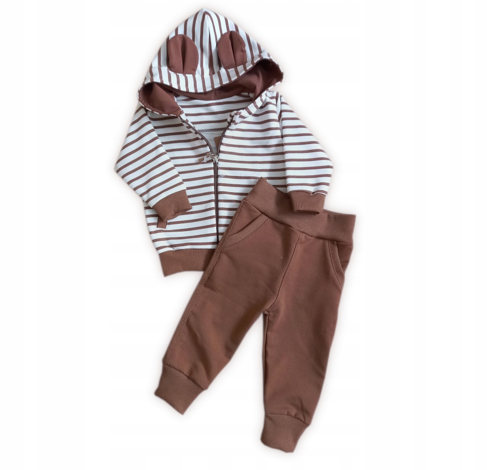 Детский комплект из коричневых брюк и толстовки в бело-коричневую полоску. У толстовки есть капюшон с пришитыми милыми ушками.