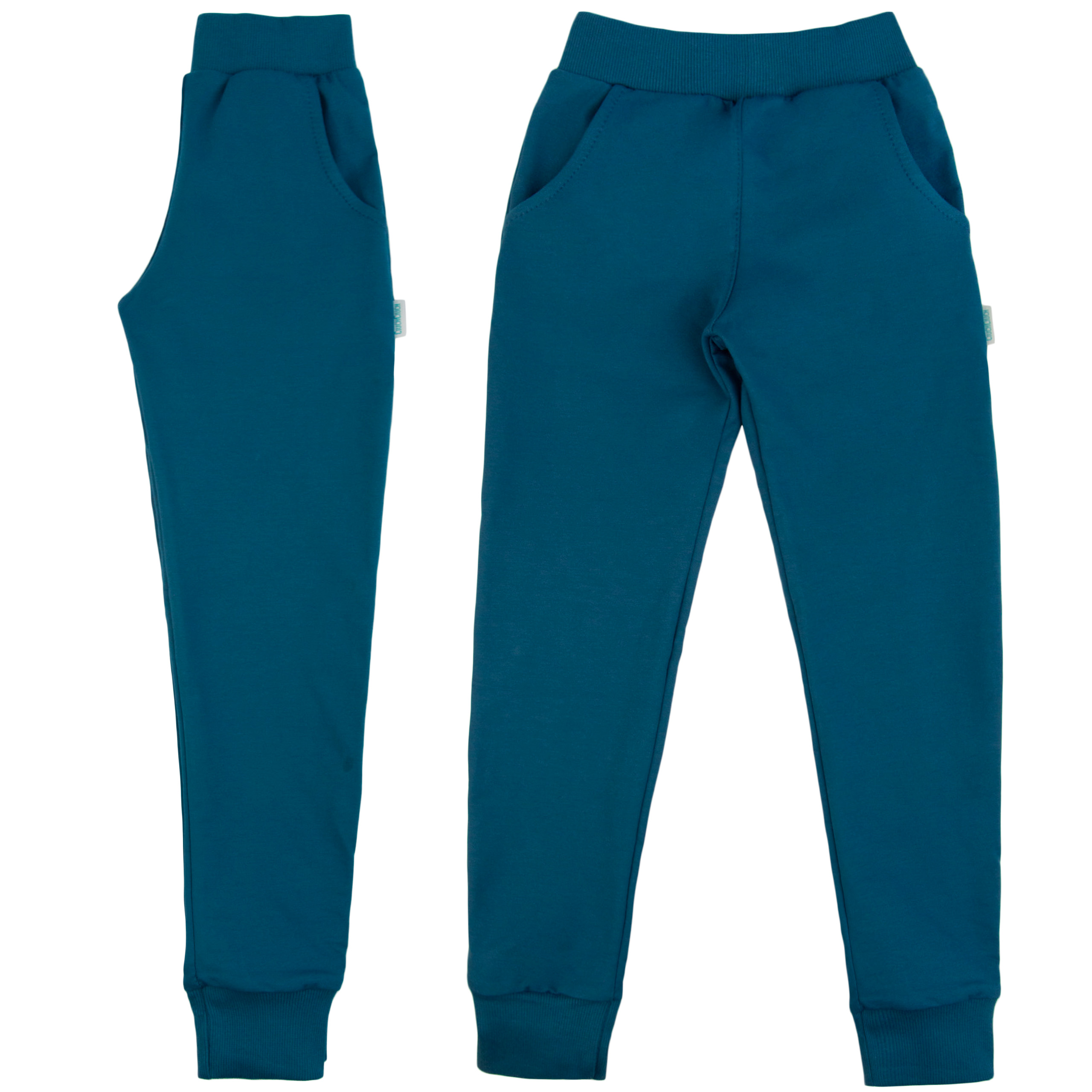 Еще один вариант нашей коллекции SLIM для стройных детей — спортивные штаны с карманами приталенного кроя цвета морской волны.