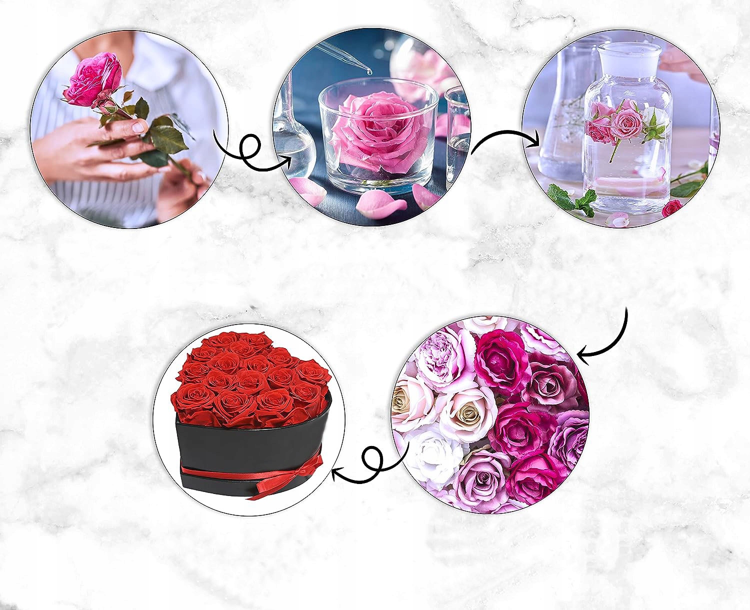 ⭕ 2. Затем цветок помещают в смесь глицерина и других натуральных растительных ингредиентов. В этом растворе роза повторно замачивается и заменяет исходные натуральные ингредиенты.