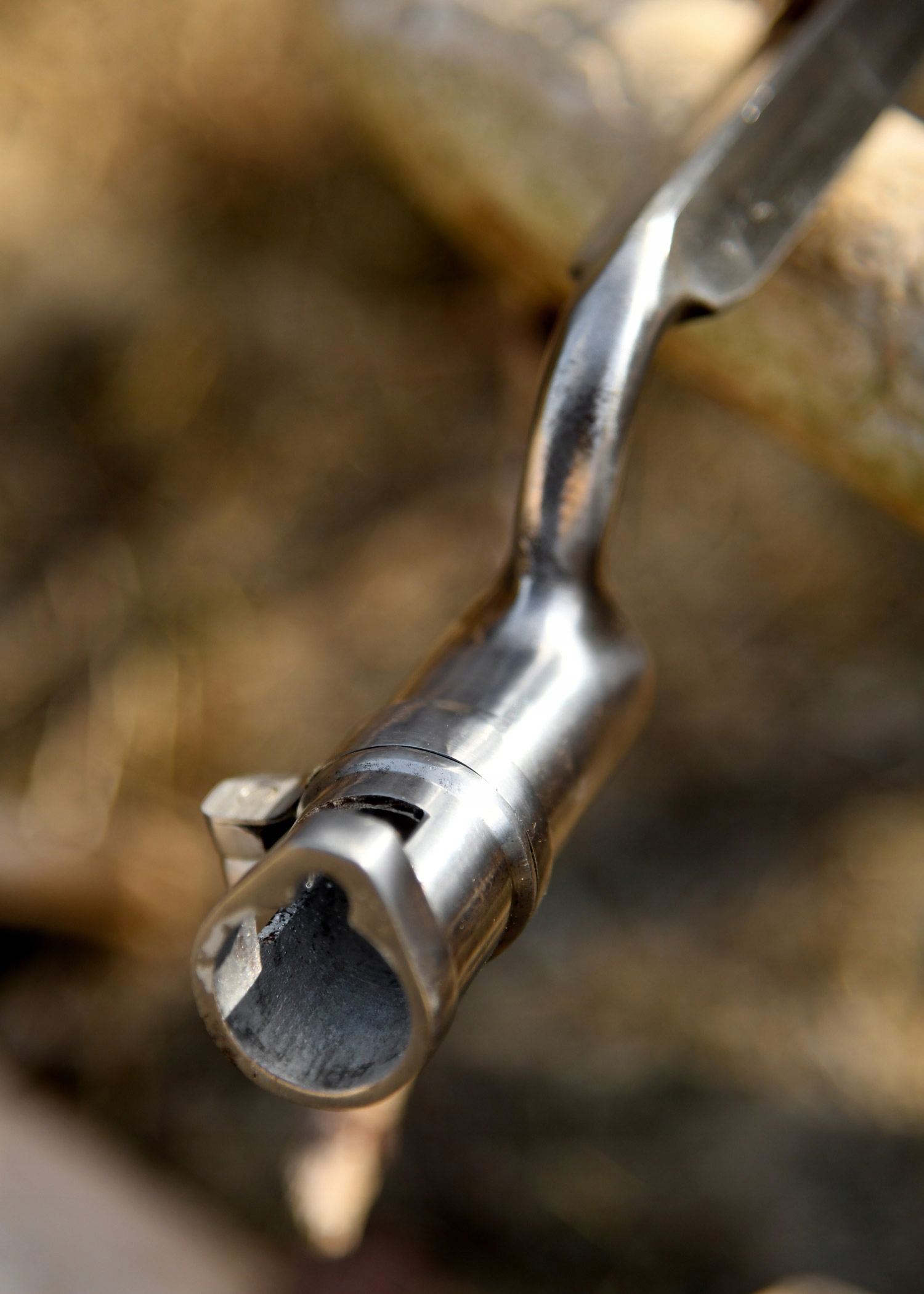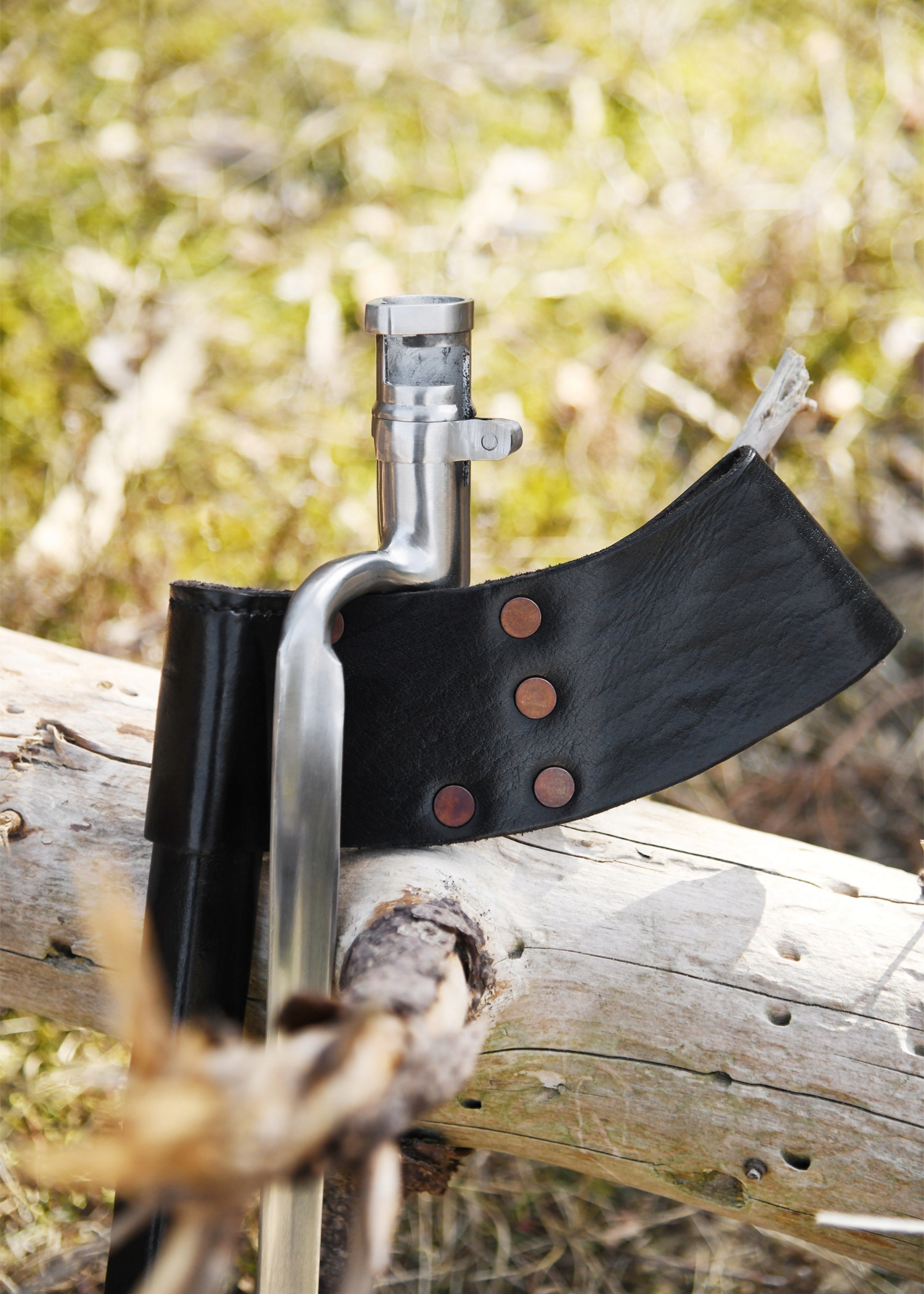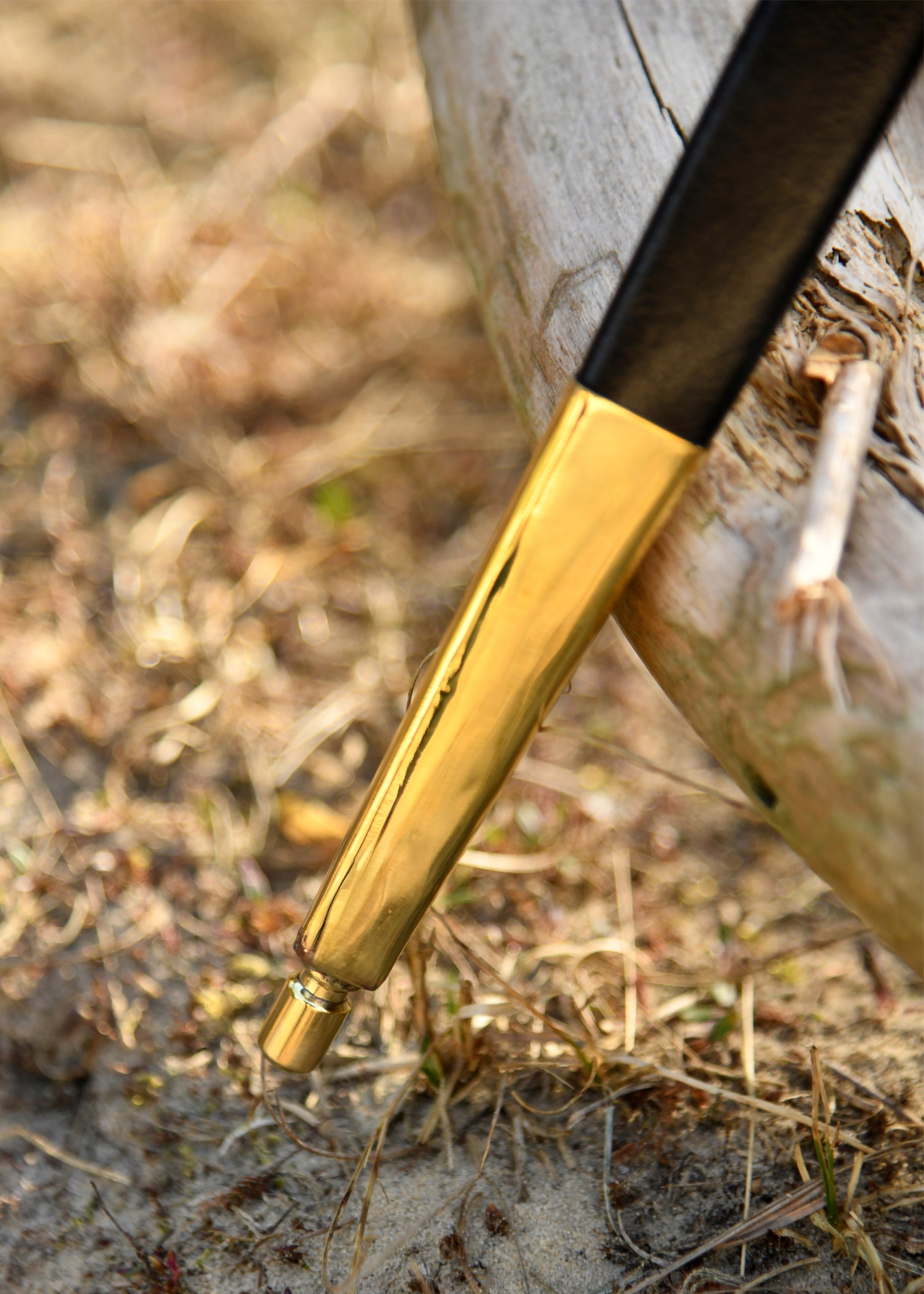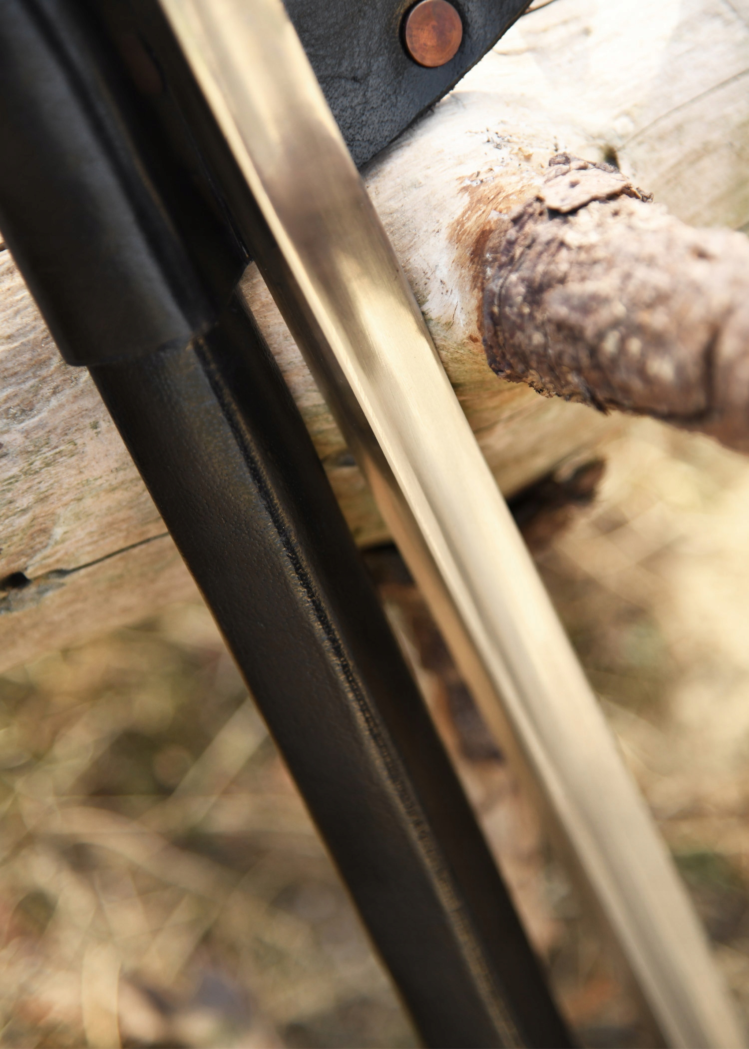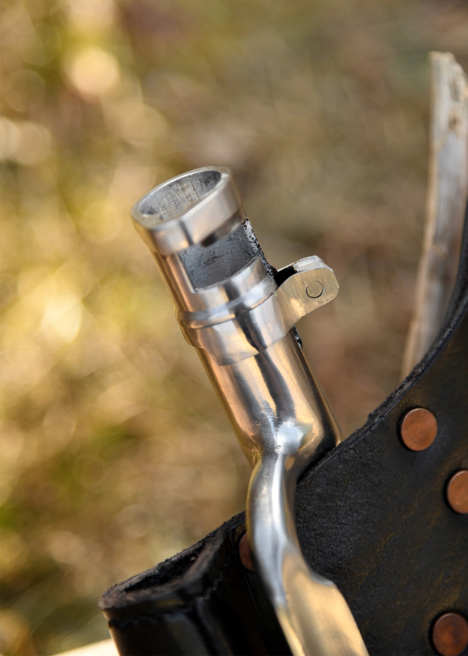 Эта реплика Springfield Bayonet изготовлена из стали. Прикрепленное влагалище кожа и имеет латунные фитинги и кожаную ручку, чтобы прикрепить к ремню.