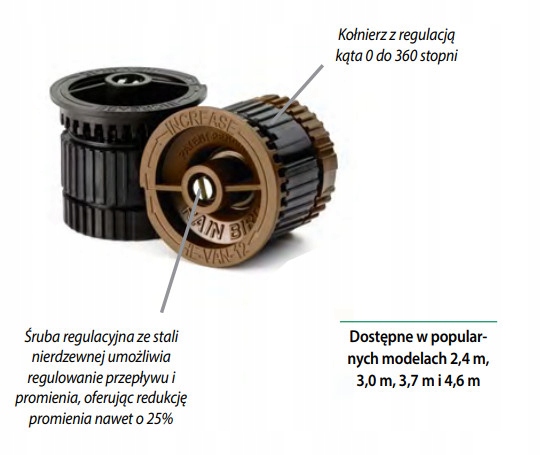 - Благодаря возможности полной регулировки в диапазоне от 0° до 360°пользователь имеет возможность эффективно орошать участок любой формы, экономя время и используя меньшее количество насадок