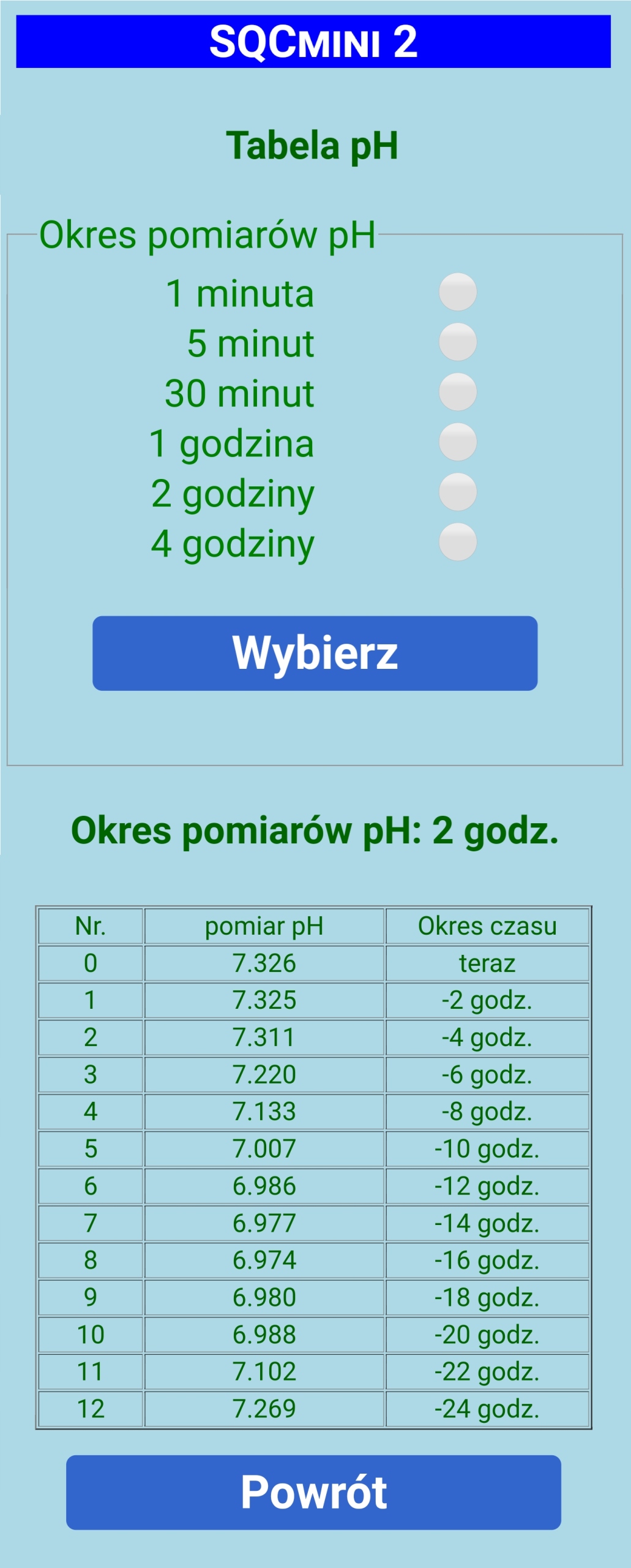 Графическая визуализация изменения pH во времени представляет собой график зависимости pH от времени в диапазоне от настоящего момента до 12 выбранных периодов назад. В течение 1 минуты мы видим изменения pH за последние 12 минут и т. д. вплоть до 4-часового периода, когда мы видим изменения pH за последние 48 часов.