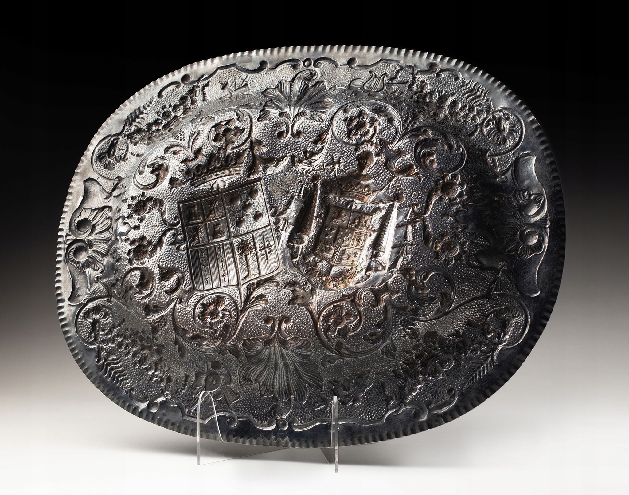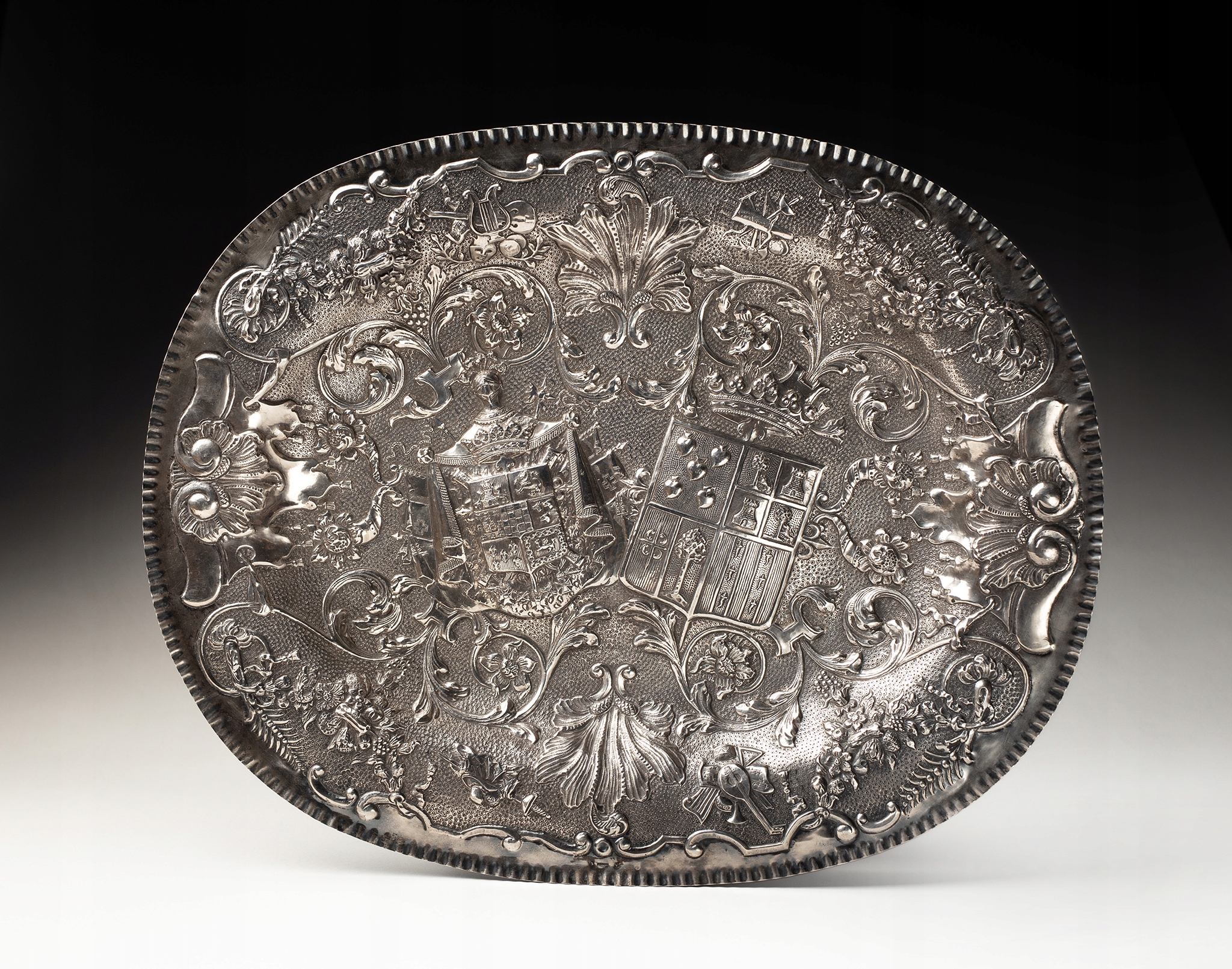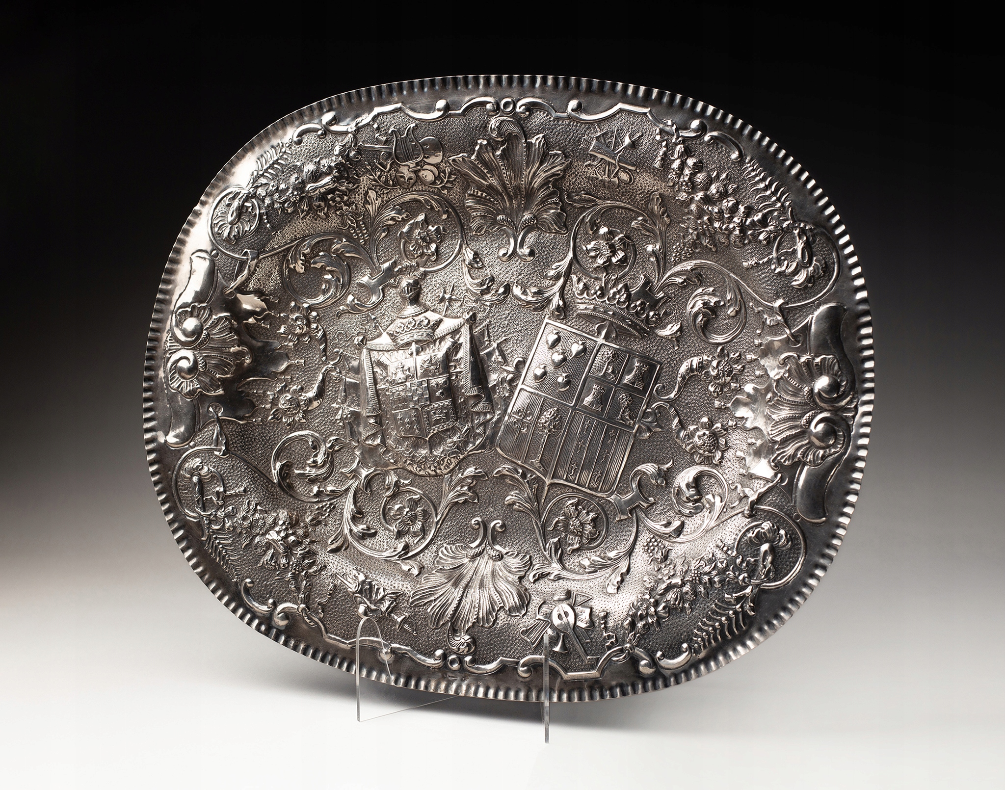 Чрезвычайно эффектный и изысканный серебряный поднос с гербами, полностью выполненный из серебра. Поднос овальной формы, приподнятые края. Почти все пространство заполнено репуссированными украшениями в виде: растительных орнаментов (листья аканта, пальметты), ламбрекенов и гирлянд. Повторяются украшения на музыкальную и батальную тематику. В центре подноса расположены два изящно вылепленных многопольных герба (скорее всего, испанского).