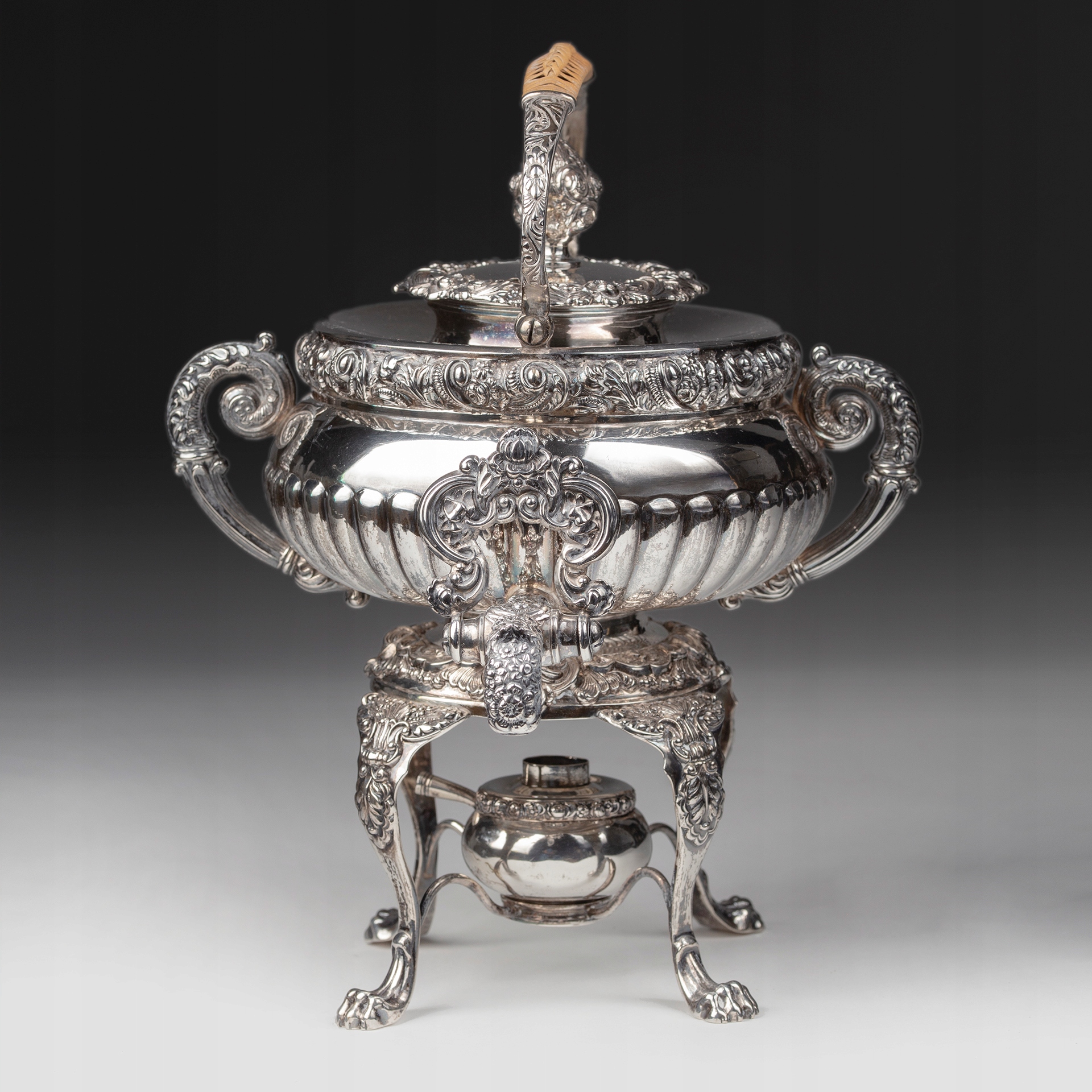 Уникальные серебряные слитки, серебро 13 пробы (эквивалент пробы 812). Каркас на четырех высоких S-образных ножках, заканчивающихся львиными лапами и декорированных в основании растительными мотивами, перекрывающими основание в виде профилированного венчика, богато украшенного пышными листьями аканта. В нижней части основания предусмотрено место для сферической каменки, украшенной орнаментом по верхнему краю, с небольшой выступающей ручкой. Сферический приплюснутый сосуд для воды с краном на дне. И кран, и его ручка богато украшены орнаментальными украшениями и цветочными мотивами. Дно контейнера средней высоты украшено вертикальными завитками, по обеим сторонам расположены две декорированные S-образные ручки. Верхняя часть окантована декорированной лентой орнаментов. Обложка круглая, гладкая по краю, окантована орнаментальным орнаментом в виде стилизованных розеток и листьев аканта, увенчанных цветком. По обеим сторонам сосуда имеется бантиковая ручка с плетёной, декорированной вставкой в центральной части.
