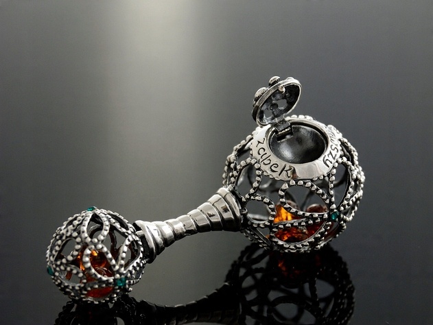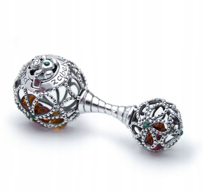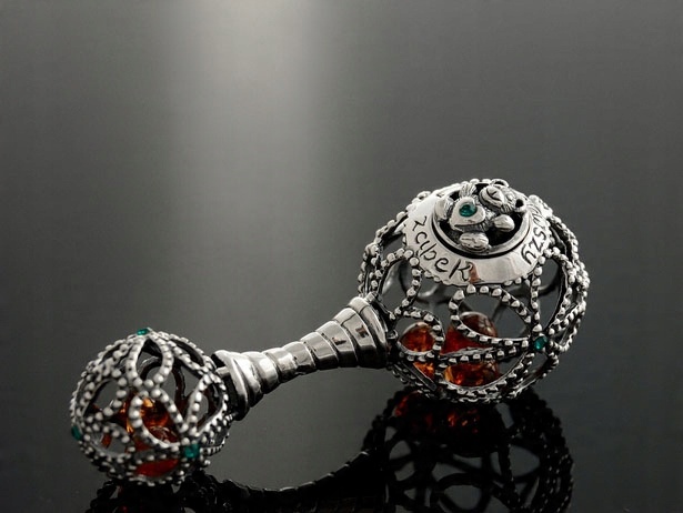 Представляем Вам серебряную погремушку с камнями янтаря -мой клевер-