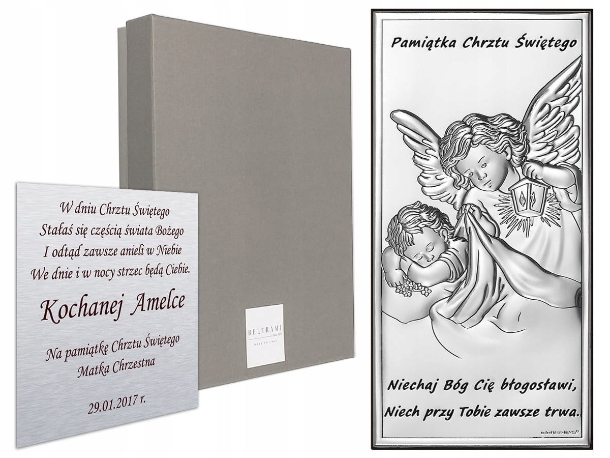 Эксклюзивная серебряная картина, бренд ,, лидер среди производителей серебряной сувенирной продукции. На прямоугольном изображении изображен Ангел с фонарем. Вверху рисунка надпись «Сувенир Святого Крещения», а внизу поздравление «Да благословит Вас Бог...». Такая картина является уникальным подарком или сувениром к особому случаю, например, к празднику Святого Крещения. Крещение.