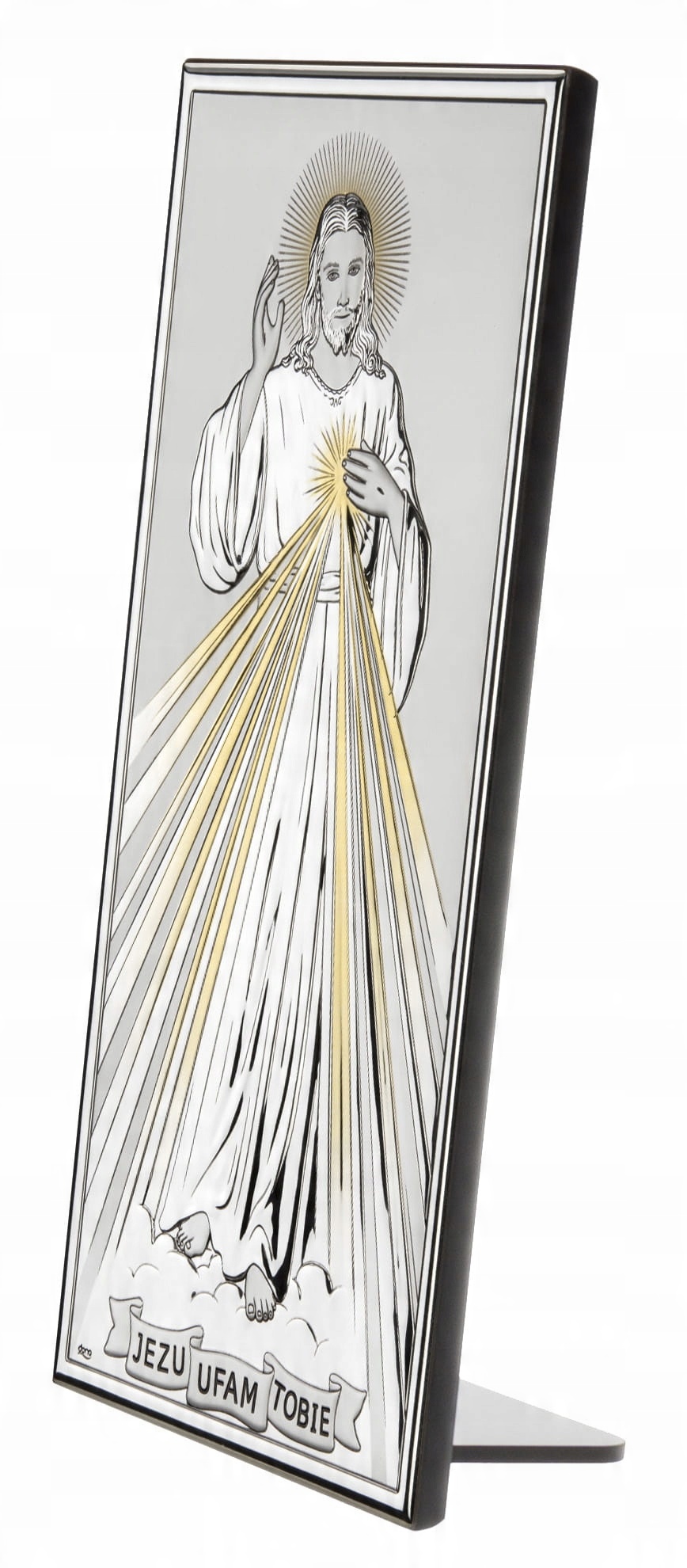 Эксклюзивная серебряная картина итальянского производства, созданная компанией производителем сувенирной серебряной продукции. На картине изображено изображение Милосердного Господа Иисуса с надписью Иисус, в Тебя я верю внизу. Элементы золотого цвета придают картине уникальности.Это уникальный подарок или сувенир к особому случаю, такому как Первое причастие, Первое причастие, свадьба или годовщина свадьбы.
