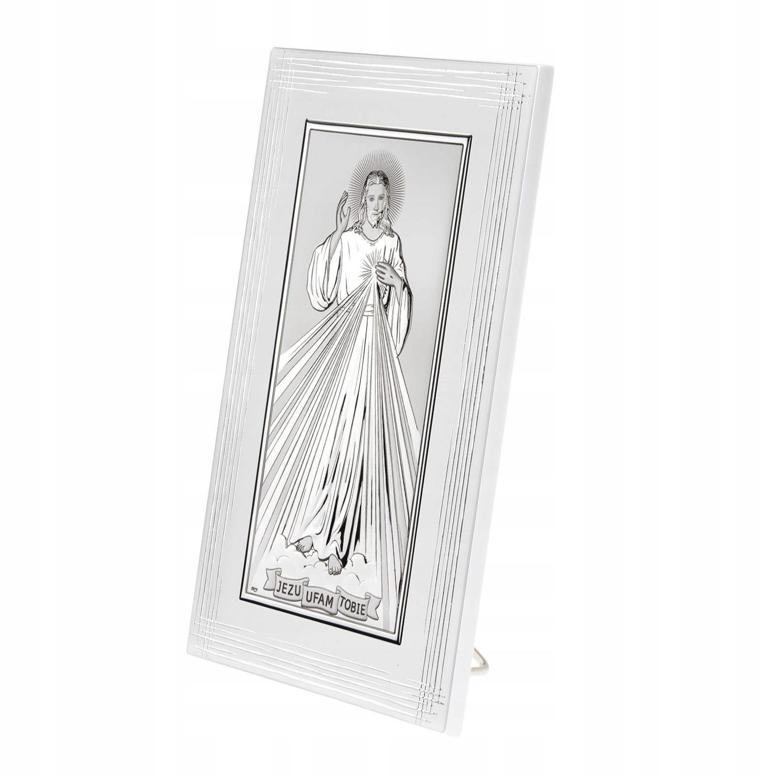 На серебряном изображении изображен Милосердный Господь Иисус с надписью внизу: «Иисус, на Тебя уповаю». Дополнительно все это помещено на белую декоративную панель. Картина является уникальным подарком или сувениром к особому случаю, такому как Первое причастие, Первое причастие, свадьба или годовщина свадьбы.