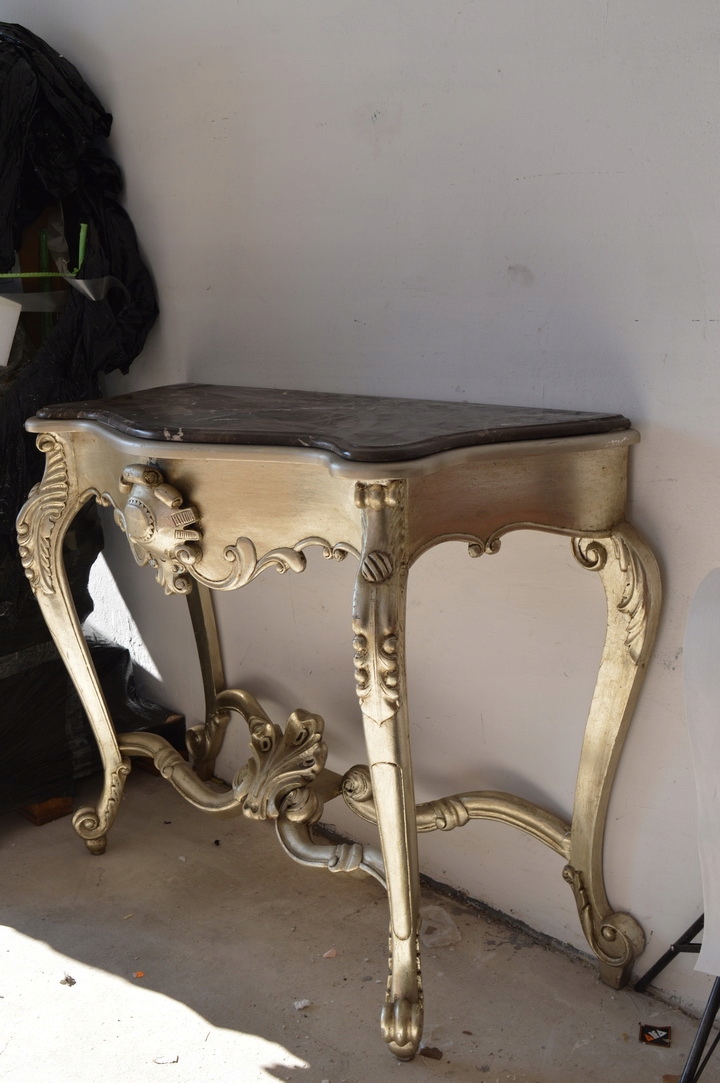 Здравствуйте, сегодня я хотел бы предложить вам невероятный серебряный деревянный консольный столик в стиле модерн с мраморной столешницей.