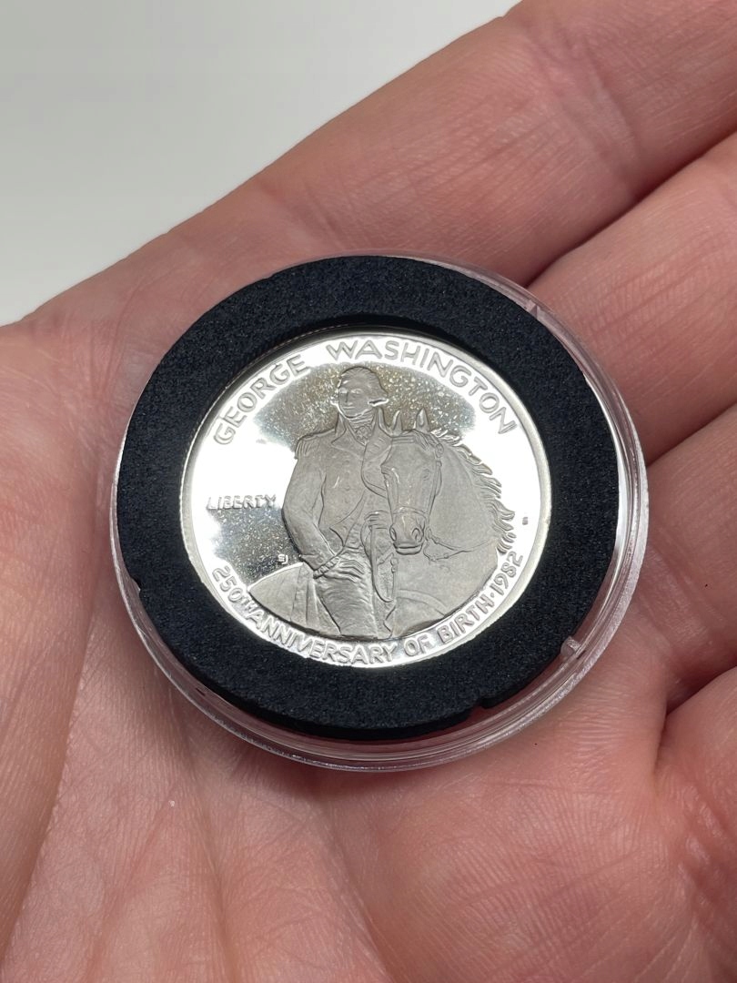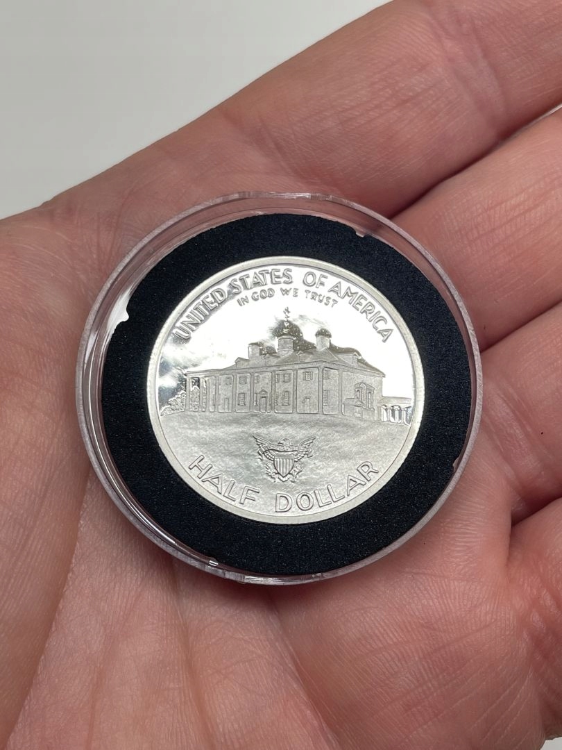 СЕРЕБРЯНАЯ МОНЕТА - США - 1/2 ДОЛЛАРА - ВЫПУЩЕНА ПО СЛУЧАЮ 250-ЛЕТИЯ РОЖДЕНИЯ ЕЖИ ВАШИНГТОНА - ДОКАЗАТЕЛЬСТВО ПОКУПКИ - СЕРТИФИКАТ