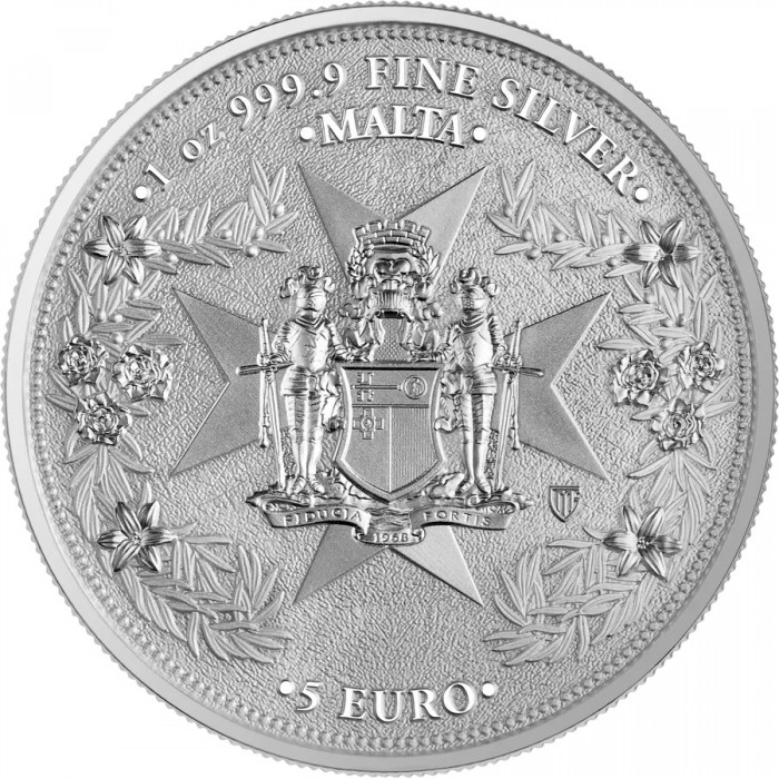 На реверсе монеты номиналом 5 евро изображен герб Мальты, помещенный на венок, вдохновленный картиной на потолке Дворца Великого Магистра в Валлетте. Все окружено оливковыми и пальмовыми ветвями, которые являются символом мира. Цветы лилии олицетворяют величие и славу, а розы являются атрибутом чистоты и гармонии. Это также первая монета со знаком монетного двора Германии.
