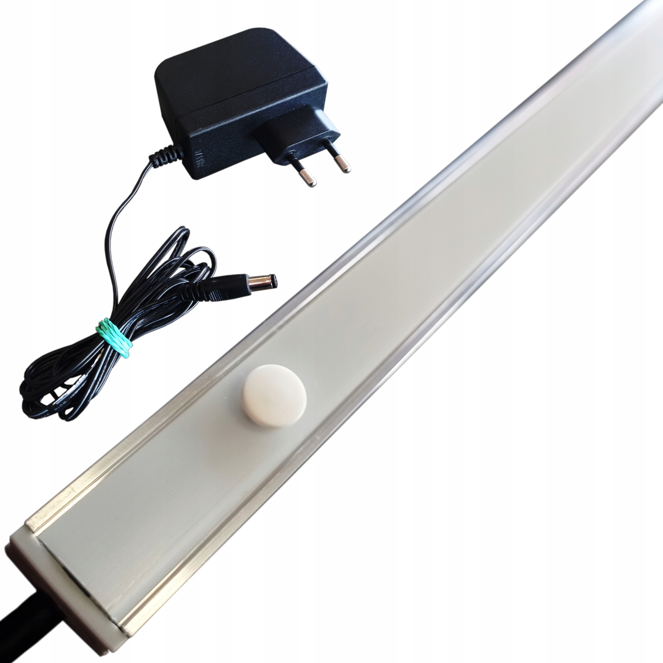 В начале ленты, со стороны кабеля, находится белая кнопка, активирующая полоску. Пуговица белого цвета, поэтому прекрасно контрастирует с серебряной полоской и идеально вписывается в опаловый абажур.